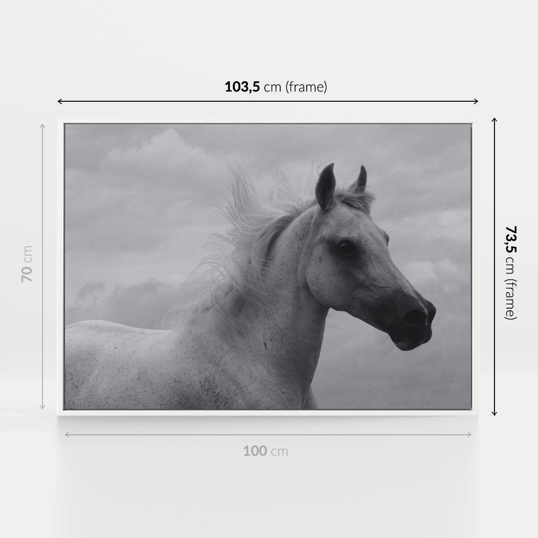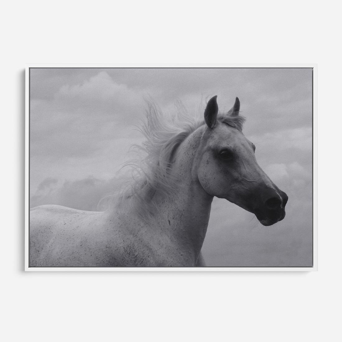 Ta czarno-biała fotografia ukazuje piękną i majestatyczną postać konia - białego z siwym umaszczeniem. Jego rozwiana grzywa i dumne spojrzenie dodają mu charakteru. Tło z przepięknymi chmurami podkreśla harmonię i siłę natury. To obraz oddający potęgę i wolność zwierzęcia, zachwycający swoją prostotą i pięknem.