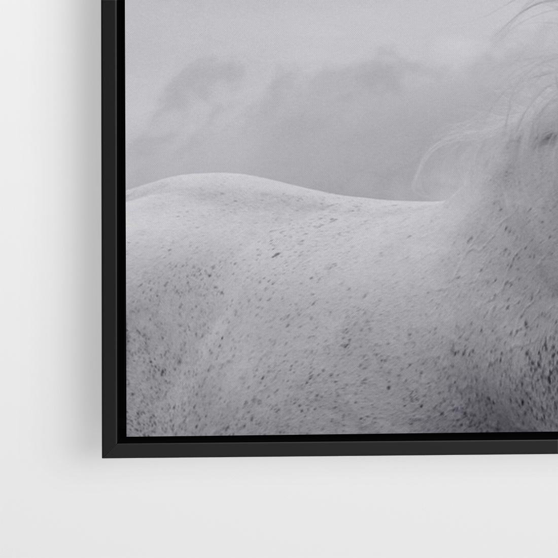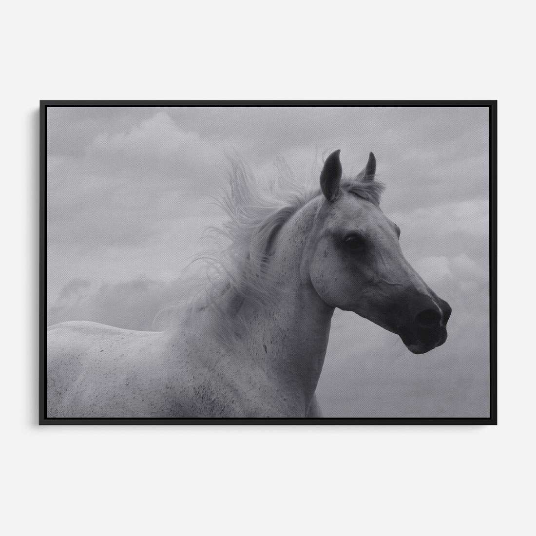 Ta czarno-biała fotografia ukazuje piękną i majestatyczną postać konia - białego z siwym umaszczeniem. Jego rozwiana grzywa i dumne spojrzenie dodają mu charakteru. Tło z przepięknymi chmurami podkreśla harmonię i siłę natury. To obraz oddający potęgę i wolność zwierzęcia, zachwycający swoją prostotą i pięknem.