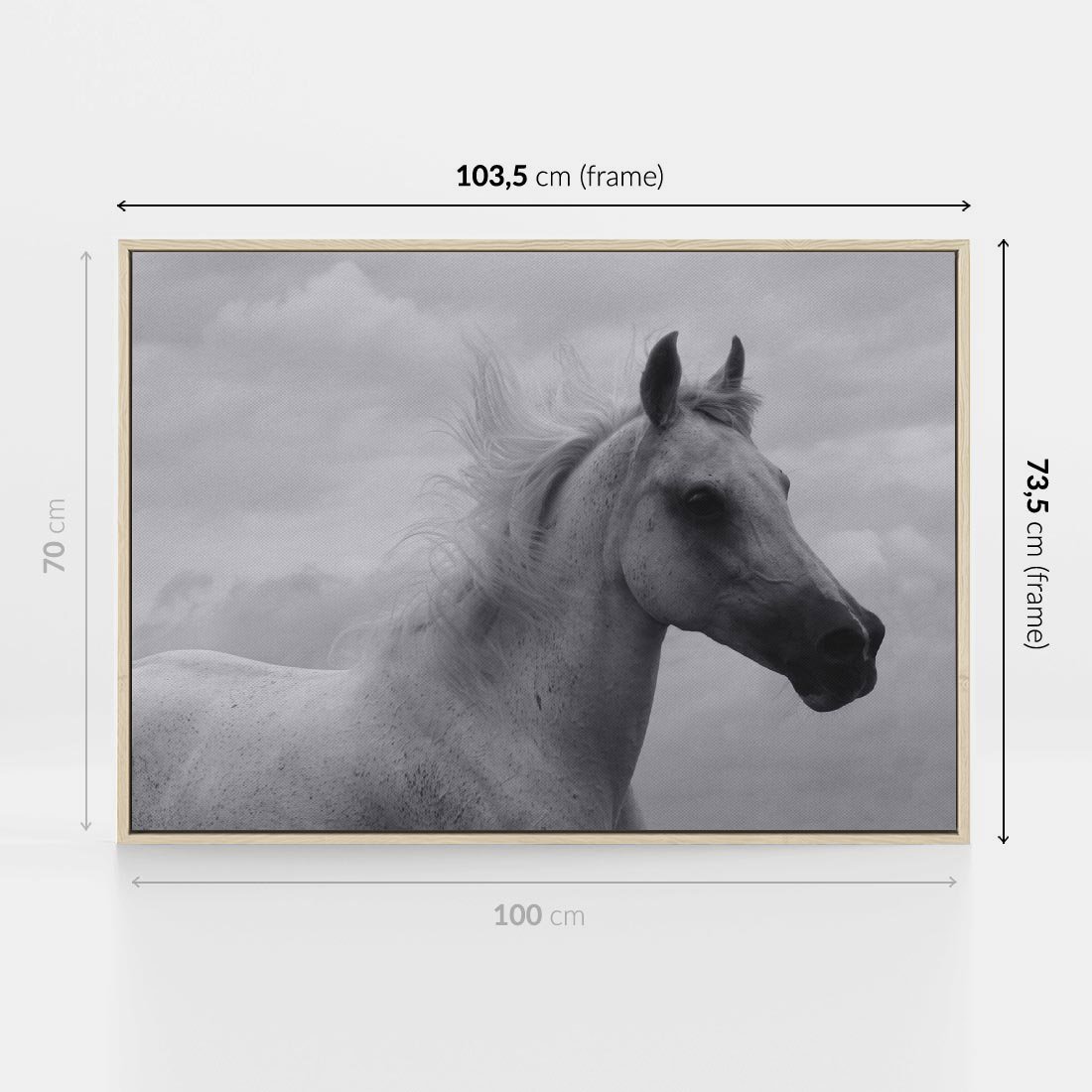 Ta czarno-biała fotografia ukazuje piękną i majestatyczną postać konia - białego z siwym umaszczeniem. Jego rozwiana grzywa i dumne spojrzenie dodają mu charakteru. Tło z przepięknymi chmurami podkreśla harmonię i siłę natury. To obraz oddający potęgę i wolność zwierzęcia, zachwycający swoją prostotą i pięknem.