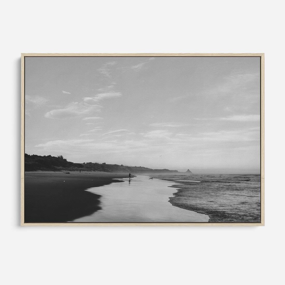 To czarno-białe zdjęcie oddaje urok nadmorskiego klimatu. Widok plaży i morza, utrwalony w monochromatycznej tonacji, nadaje temu obrazowi nostalgii i atmosfery spokoju. To idealna dekoracja dla tych, którzy kochają nadmorskie widoki i chcą przenieść kawałek plażowej atmosfery do swojego wnętrza.