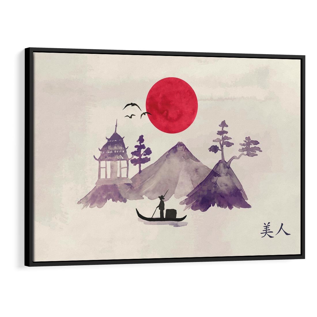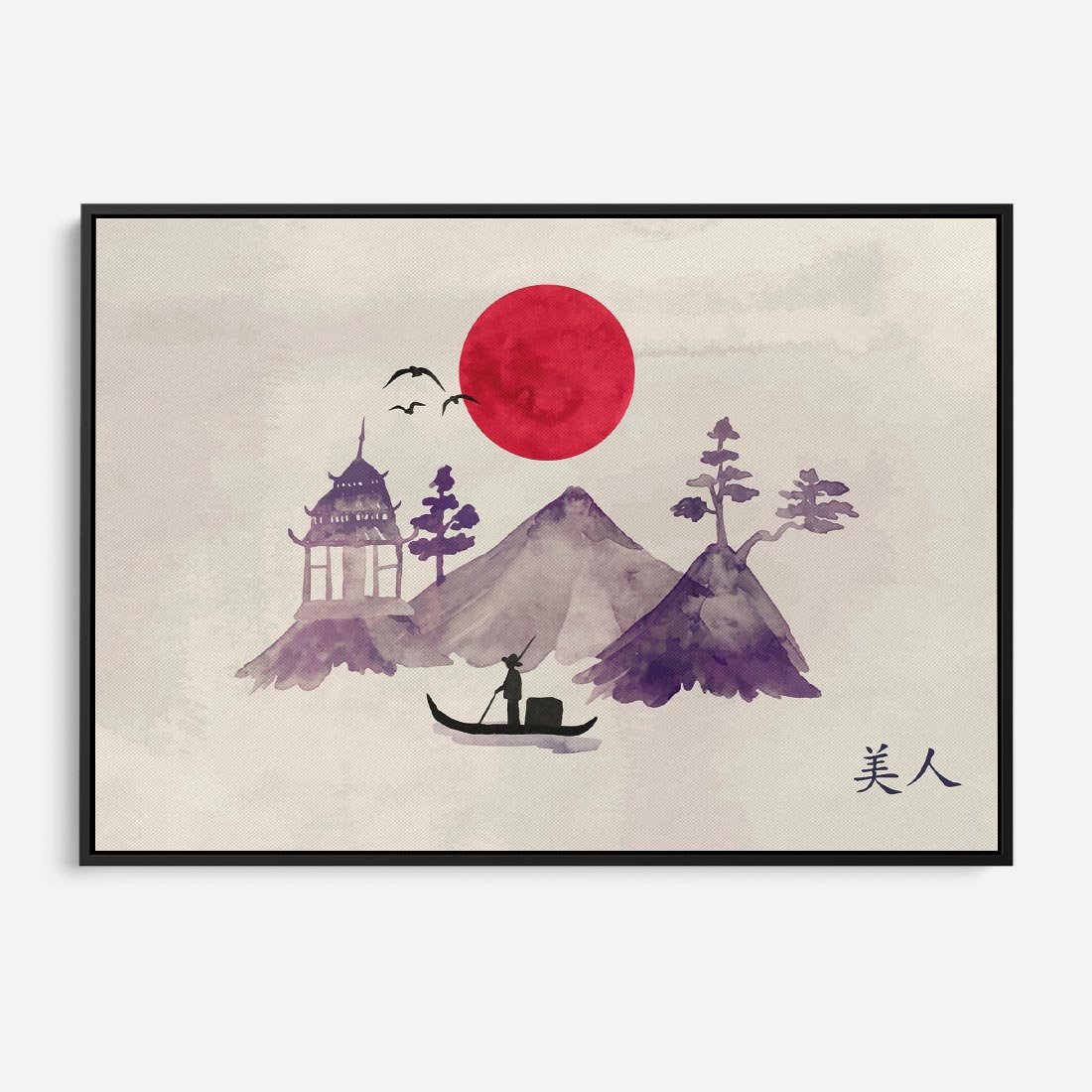 Ta urocza akwarela ukazuje japońską łódź na spokojnym jeziorze, z czerwonym słońcem na horyzoncie. Sztuka emanuje harmonią i spokojem, charakterystycznymi dla japońskiej sztuki. Przenosząc nas w magiczny świat natury, obraz ukazuje urok przyrody i zachodu słońca.