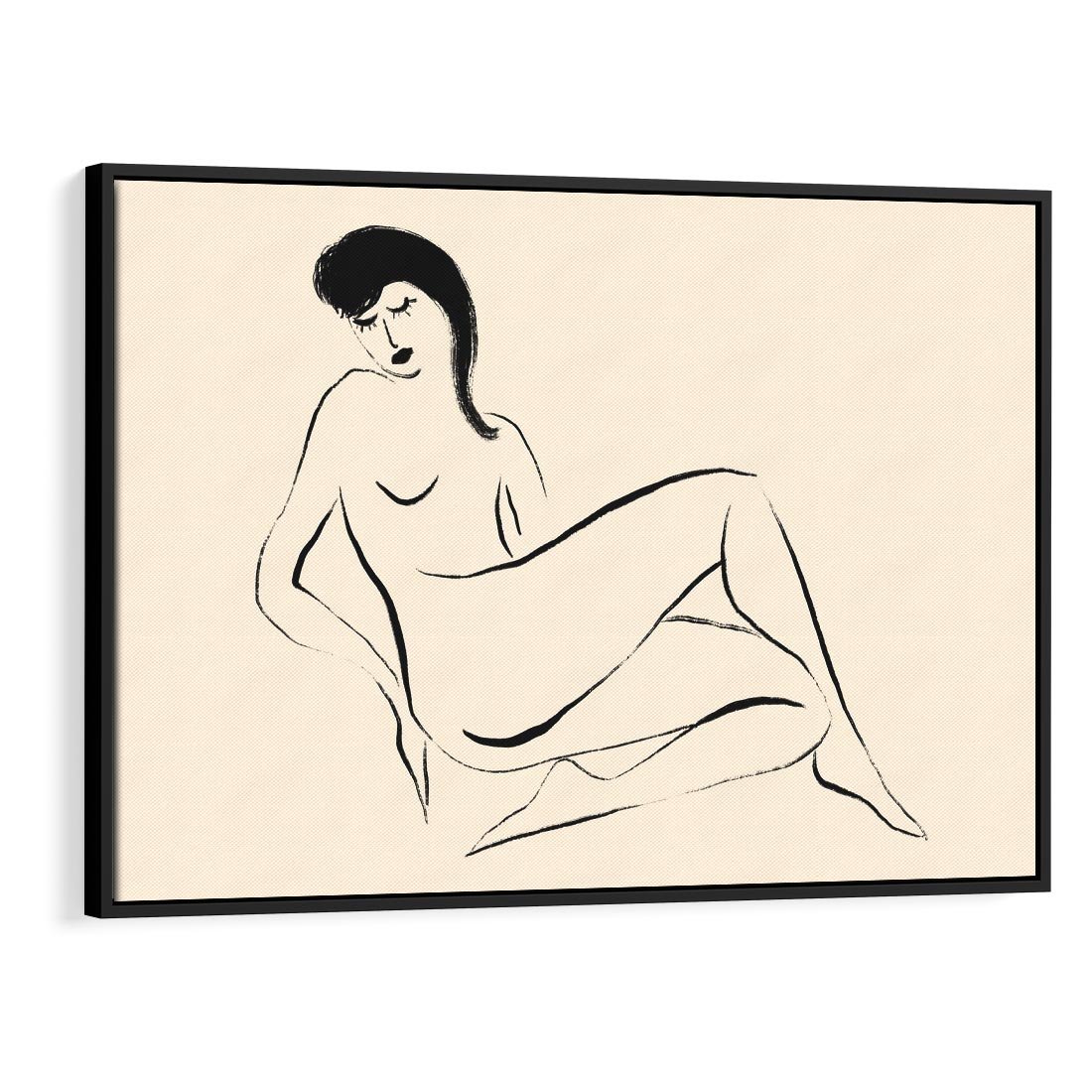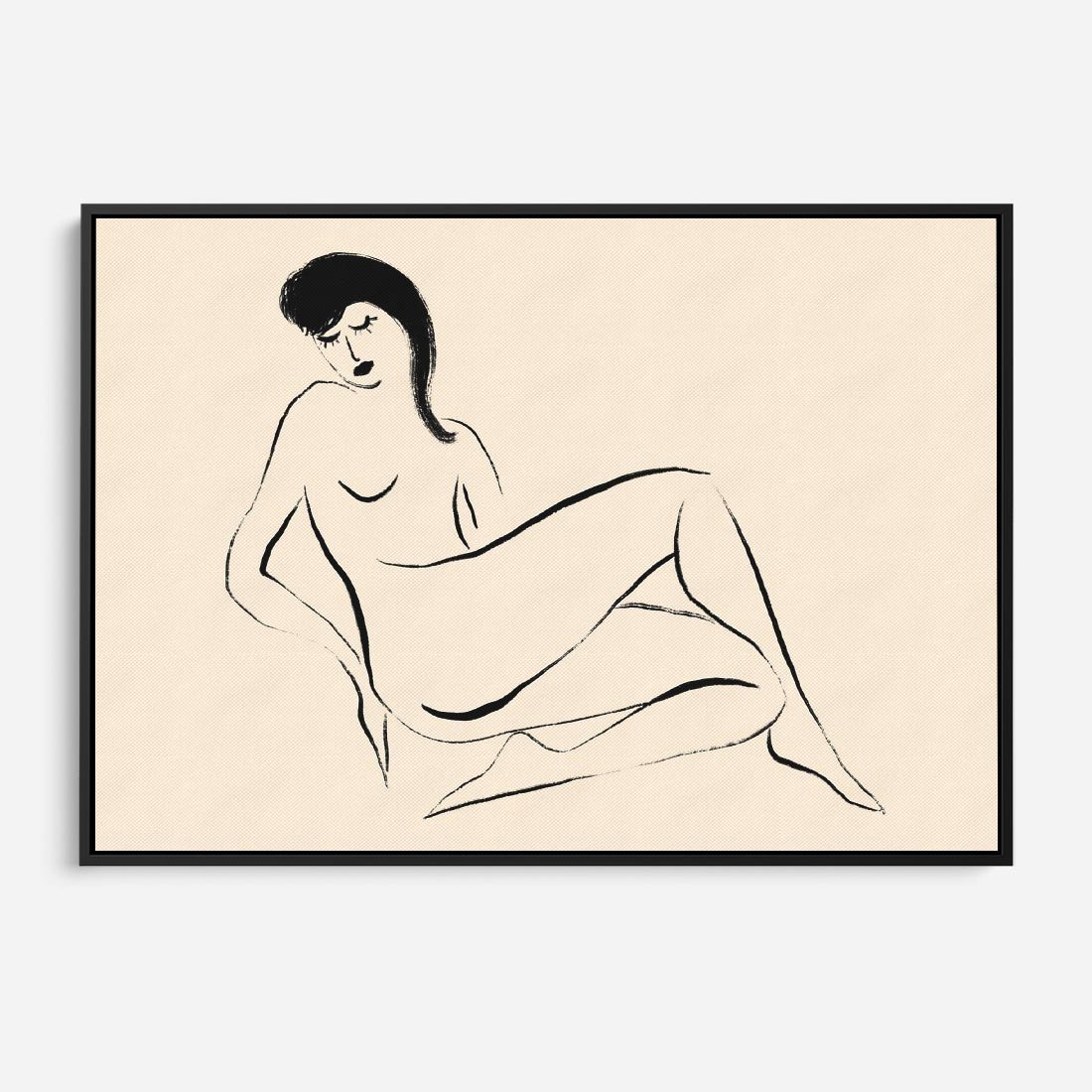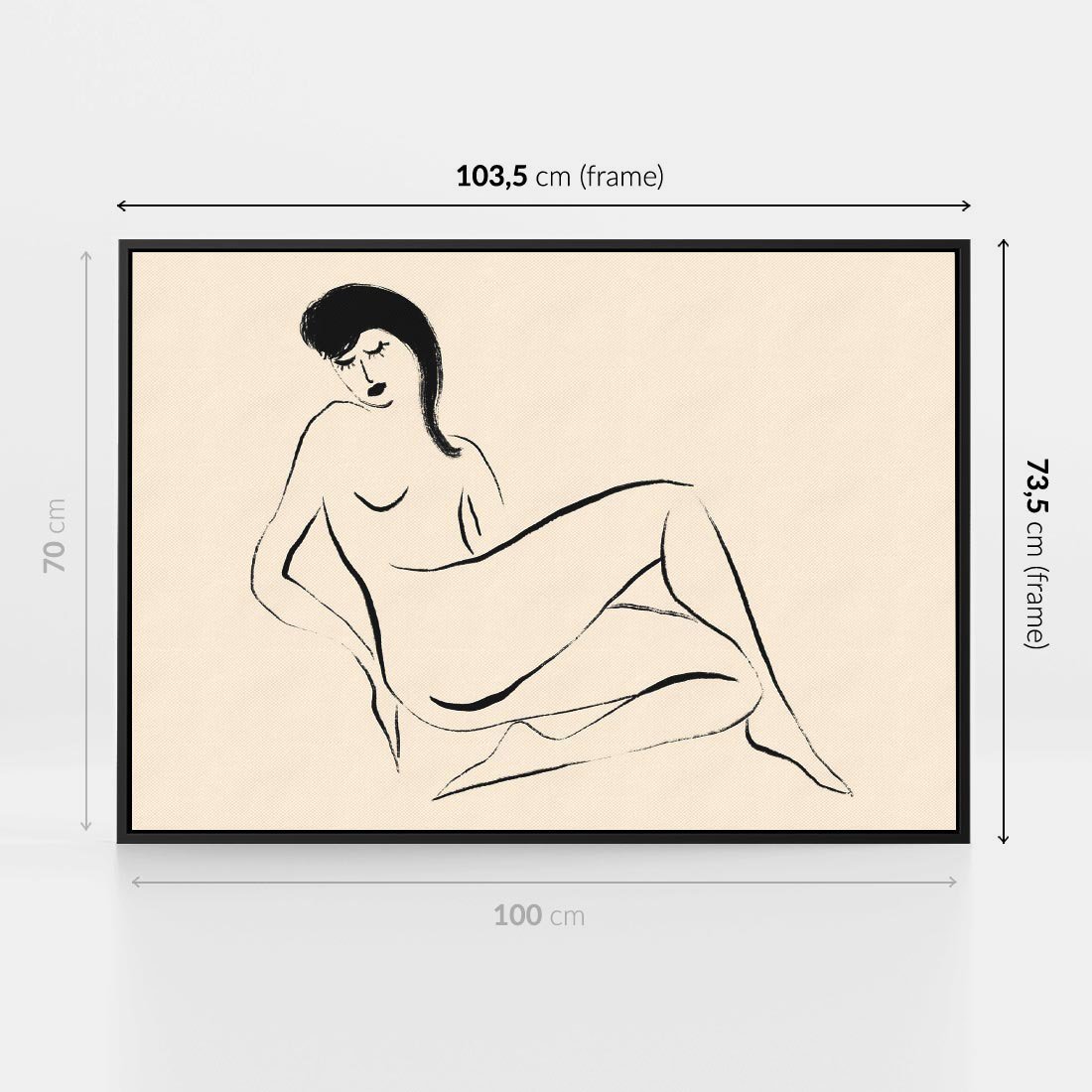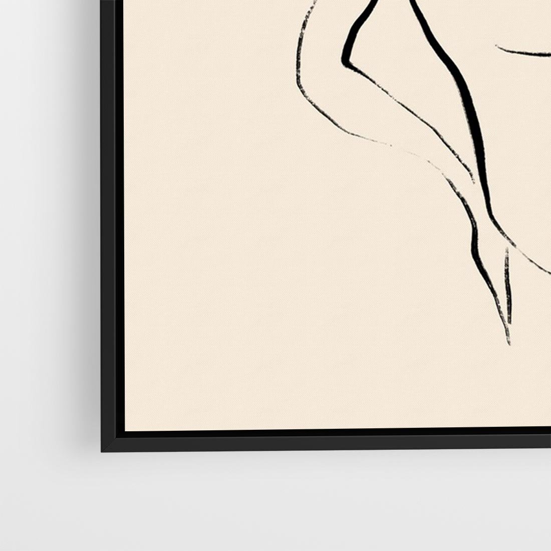 Ten abstrakcyjny rysunek w czarno-białym stylu namalowany minimalistyczną kreską przedstawia nagą kobietę. Delikatne linie podkreślają jej piękno i subtelność, jednocześnie pozostawiając miejsce na wyobraźnię i interpretację. To dzieło sztuki emanuje prostotą, jednocześnie ukazując głębię i wyrazistość ludzkiej formy.