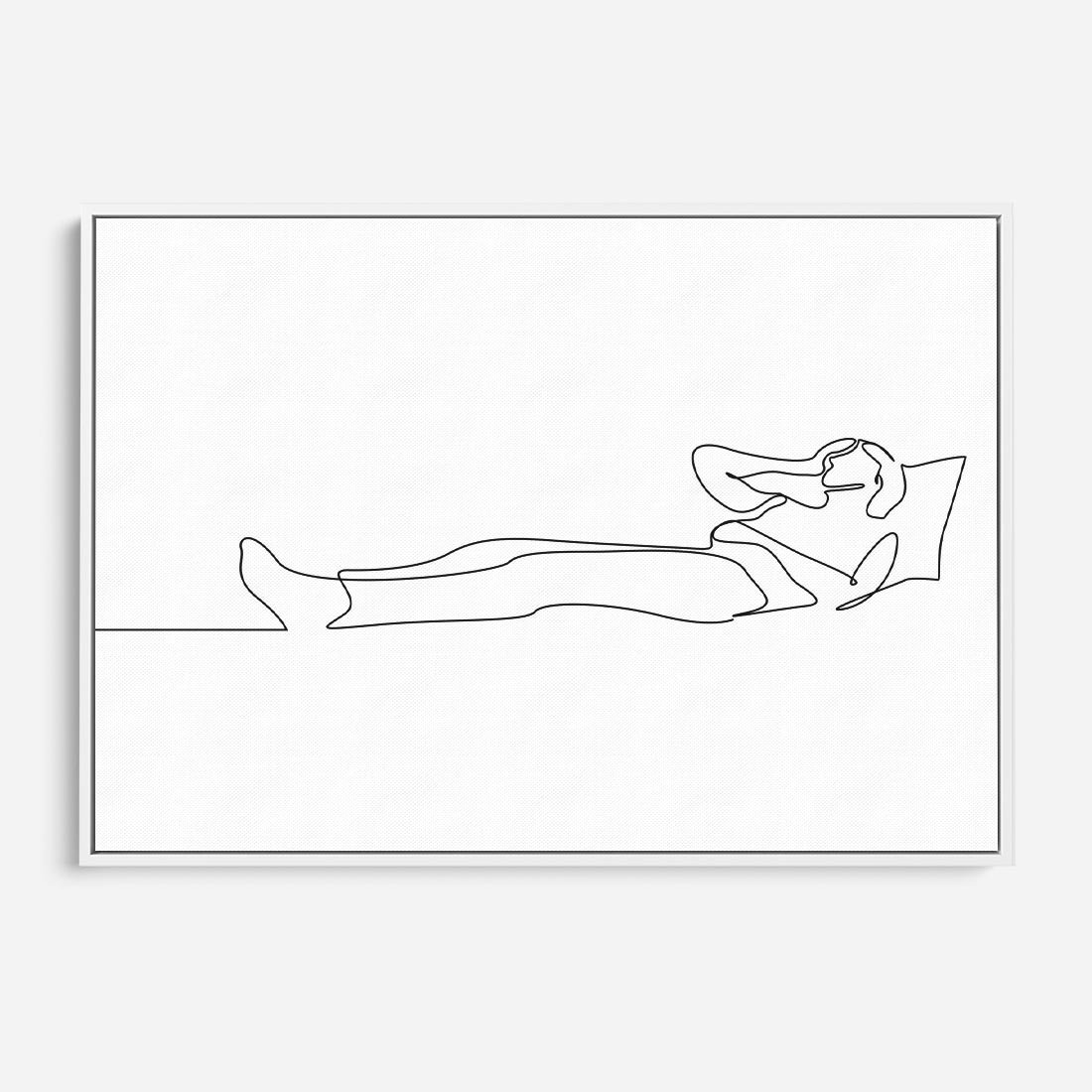 Ten rysunek wykonany w jedną linią ukazuje postać odpoczywającą w łóżku. Idealny dodatek do sypialni lub salonu, nadając przestrzeni spokój i relaks. Wyjątkowa technika one line art podkreśla prostotę i piękno ludzkiej formy, przyciągając wzrok swoją artystyczną elegancją.