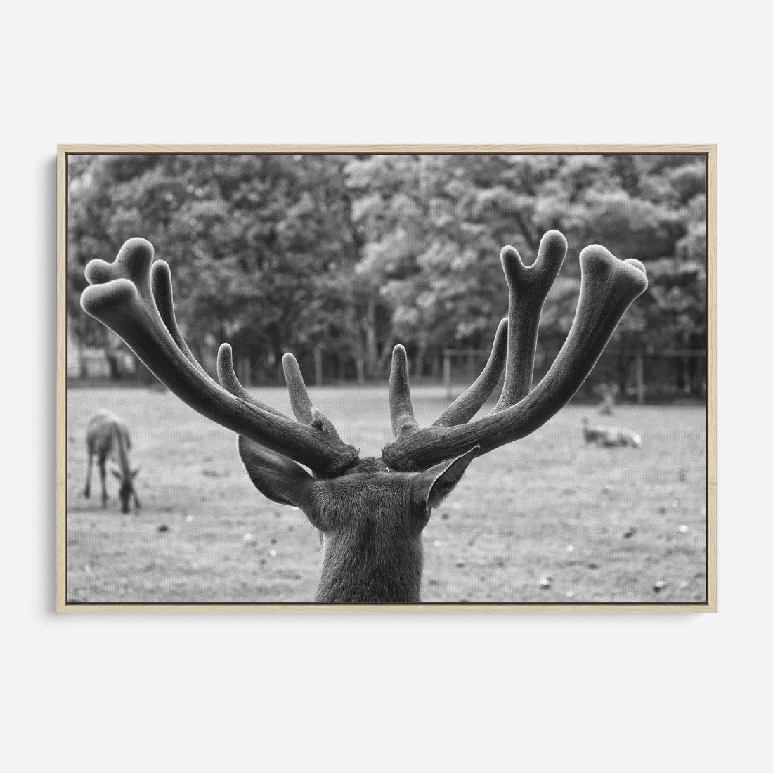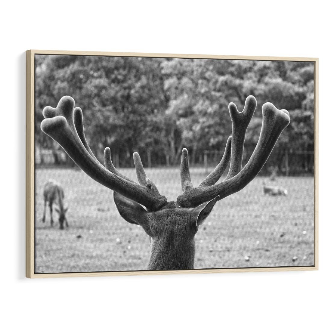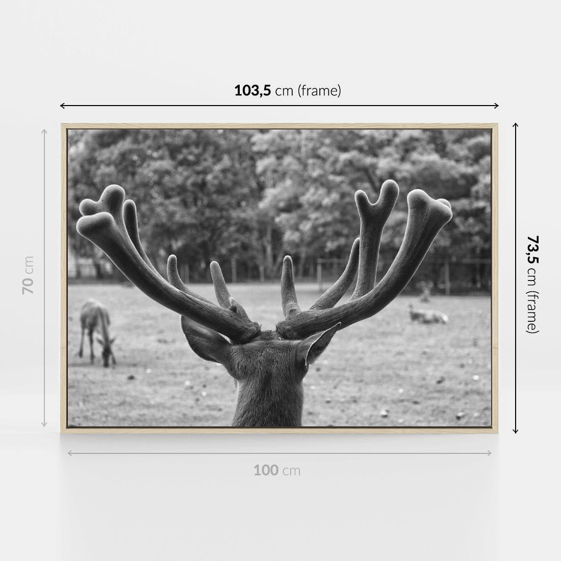 Obraz w ramie 100x70 - Przygubione motyle marzeń - fotografia czarno biała, młody jeleń w zagrodzie - rama drewno