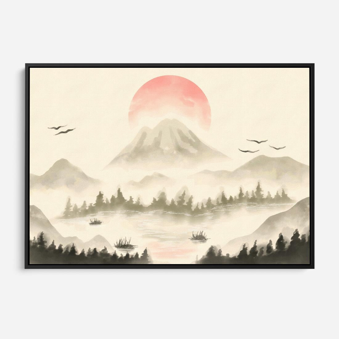 Ta urocza japońska akwarela przedstawia malownicze góry, las i zamglone jezioro, oświetlone przez czerwone słońce. Kompozycja emanuje spokojem i harmonią natury, charakterystyczną dla krajobrazów Japonii. Delikatne linie i subtelne kolory tworzą wrażenie mglistego poranka.