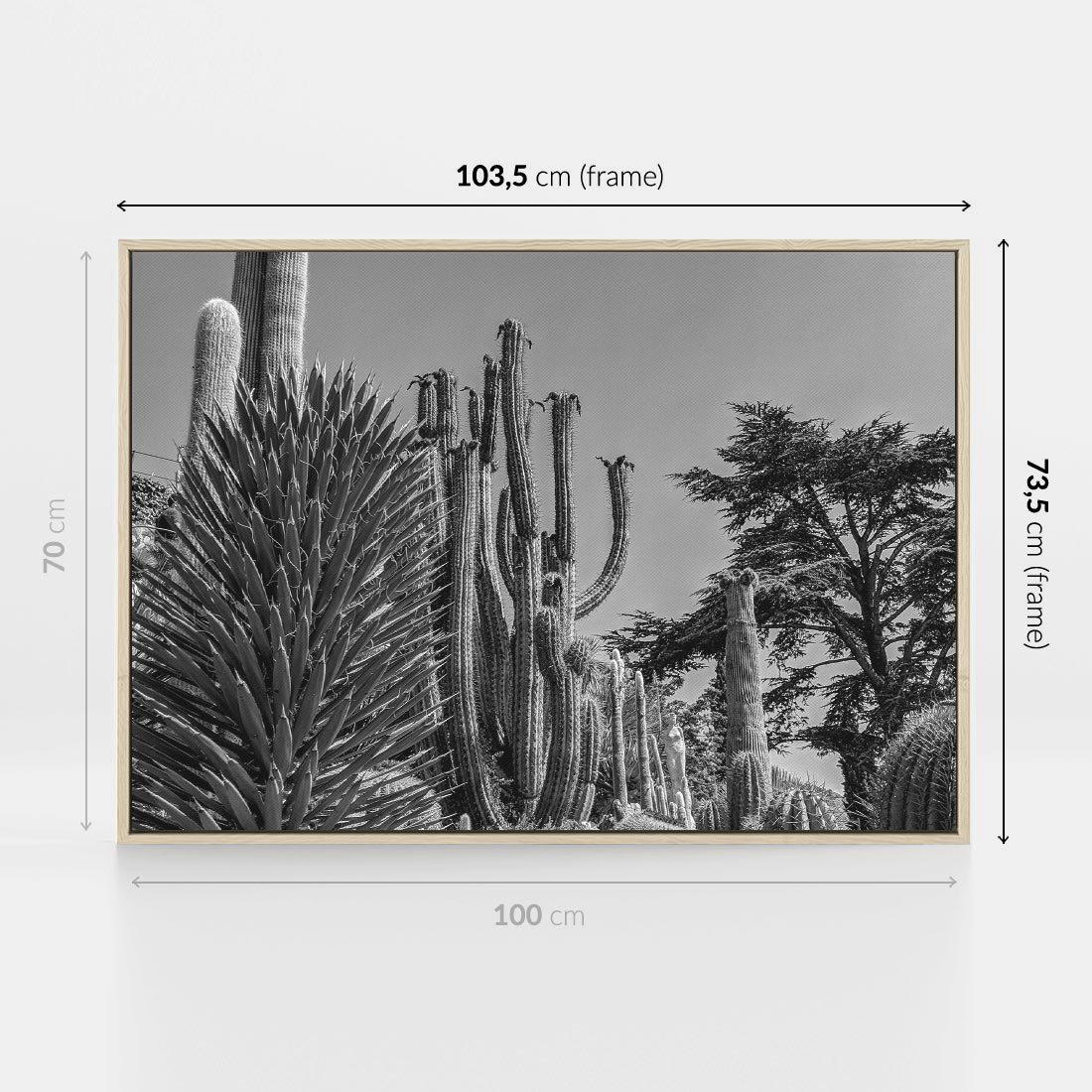 To czarno-białe zdjęcie ukazuje surową piękność pustyni, gdzie wydźwięk kontrastujących odcieni czerni i bieli podkreśla jej dzikość i spokój jednocześnie. Kaktusy, rosnące w tej niegościnnej przestrzeni, dodają kompozycji życia i symbolizują wytrwałość w trudnych warunkach. To zdjęcie emanuje spokojem i samotnością pustyni, co czyni je idealnym dodatkiem do minimalistycznych wnętrz, podkreślając urok prostoty i natury.