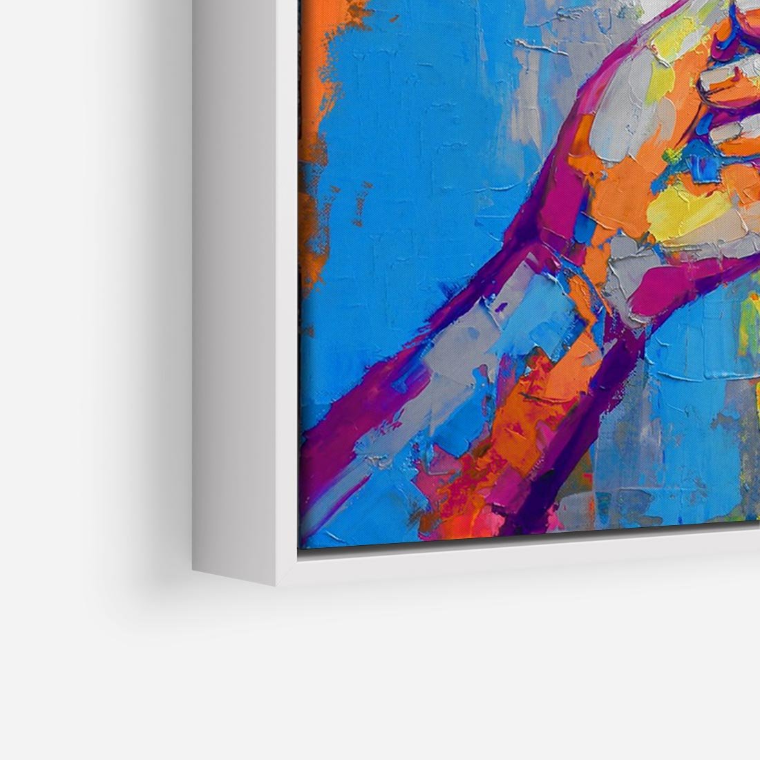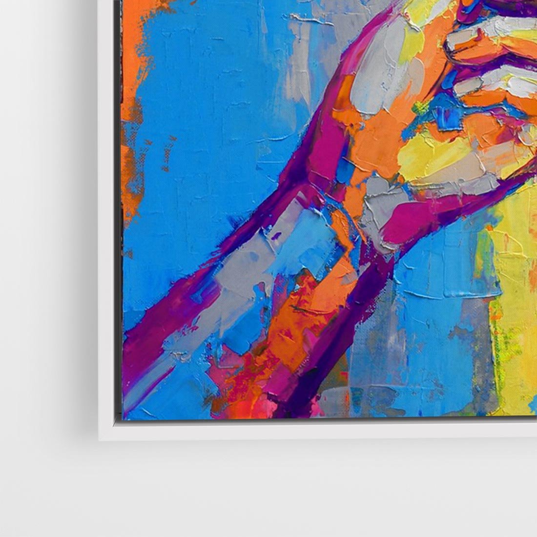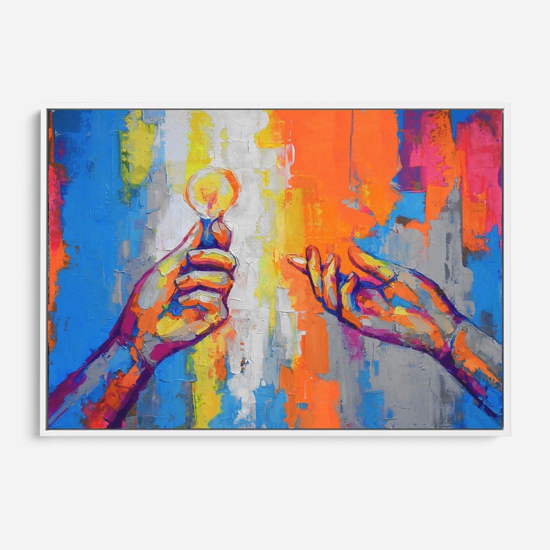 To abstrakcyjne dzieło ukazuje dłoń trzymającą żarówkę, symbolizującą pomysł i inspirację. Nieoczywiste kolory, głównie żółć i niebieski, podkreślają niezwykłość i wyjątkowość tej idei. Całość kompozycji emanuje kreatywnością i wizją, zachęcając widza do odkrywania nowych horyzontów. To malarskie arcydzieło przypomina nam, jak ważne jest odkrywanie nieznanych obszarów umysłu, by odnaleźć wyjątkowe rozwiązania.