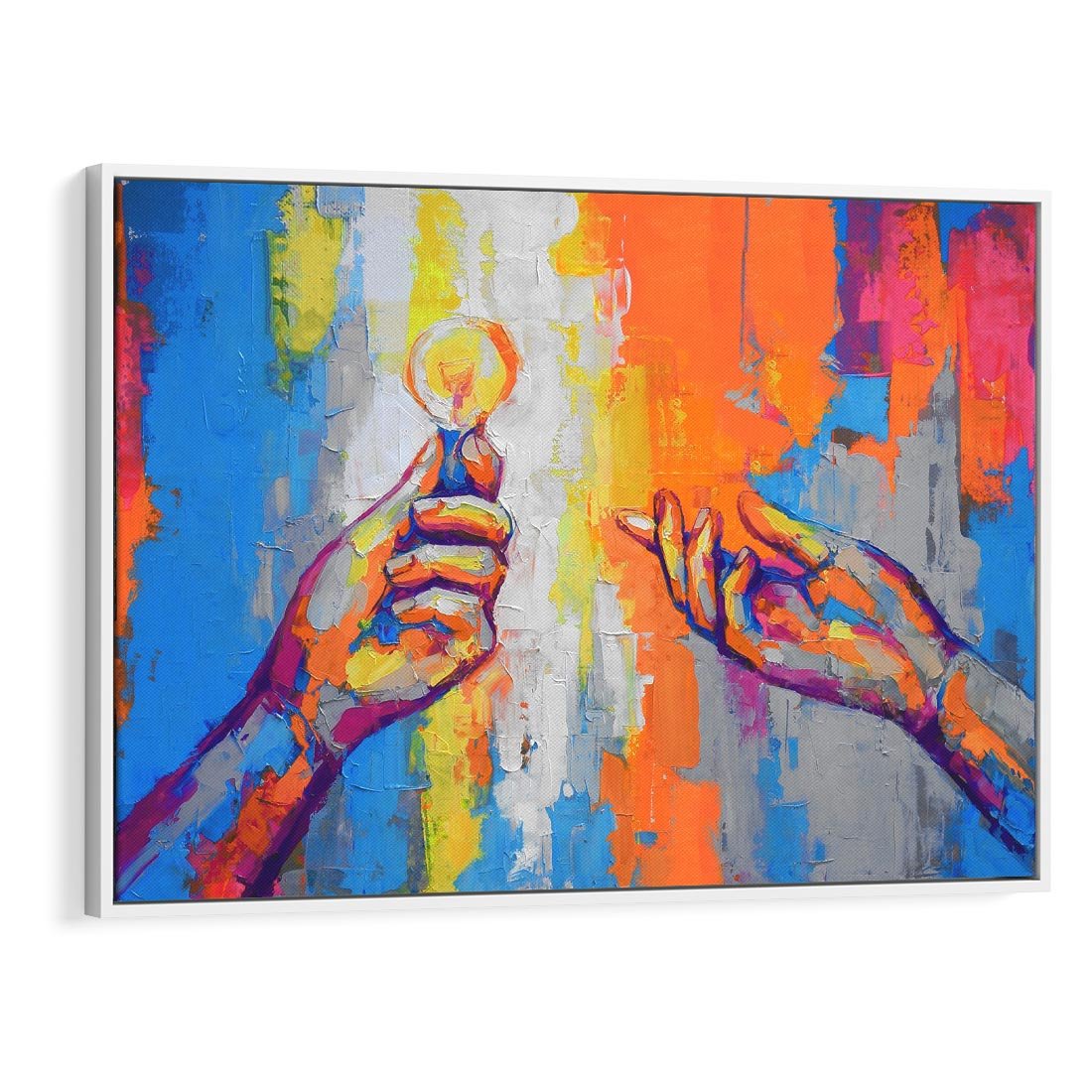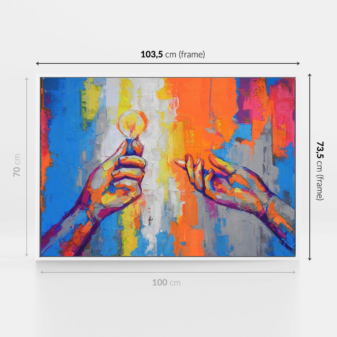 Obraz w ramie 100x70 - Refrakcje wewnętrznego światła - abstrakcyjne dzieło, dłoń trzyma żarówkę - rama biała