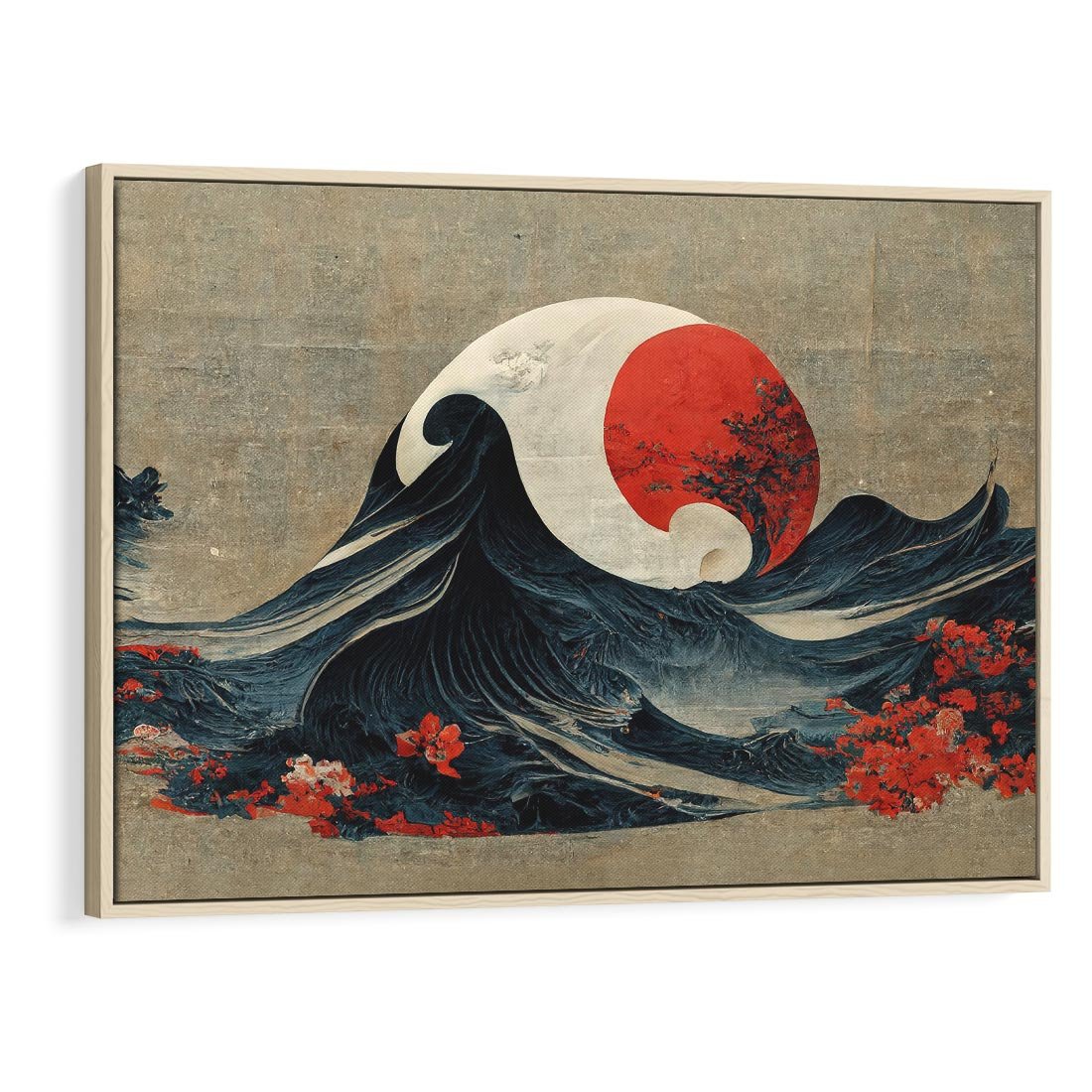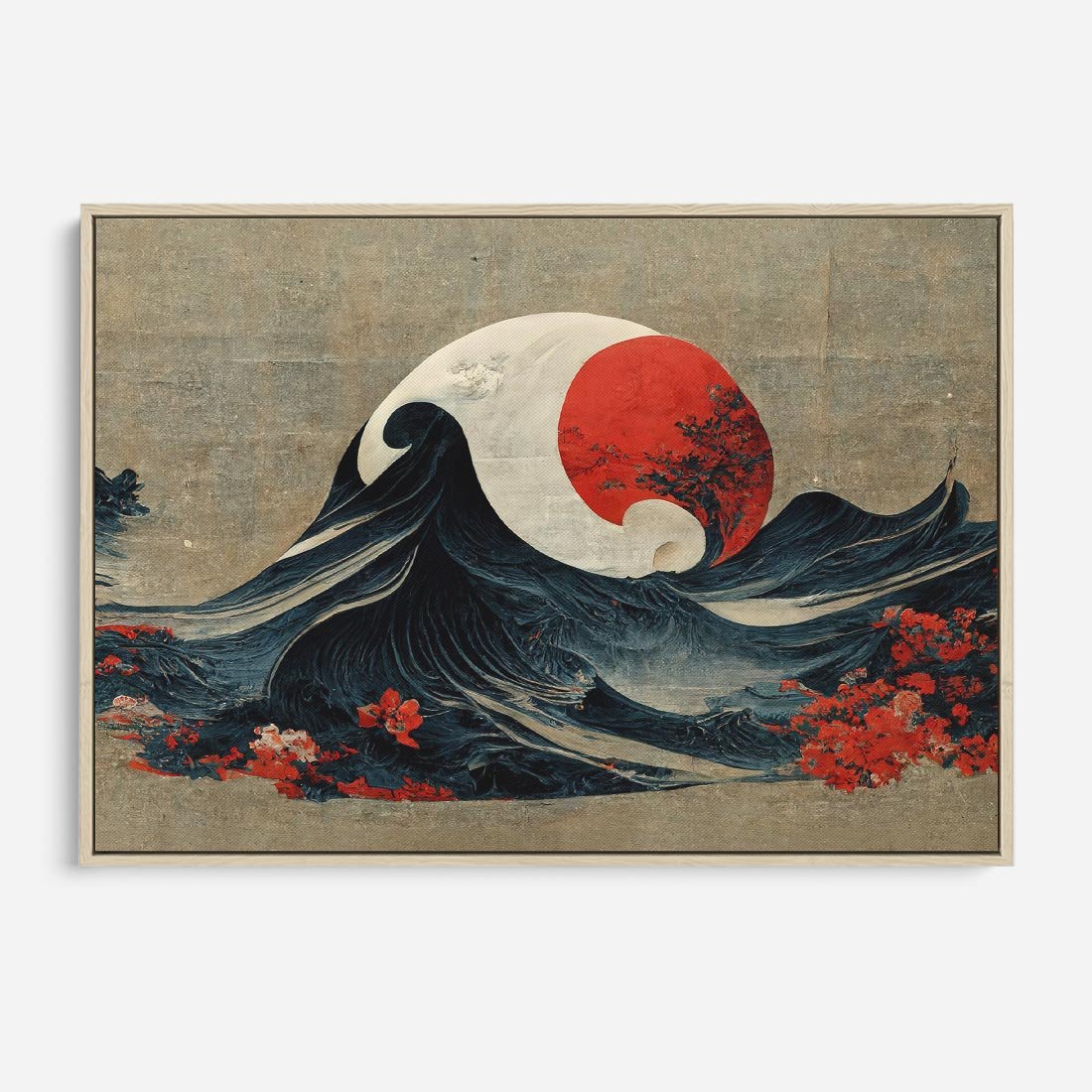 Przenieś się do fascynującego świata sztuki japońskiej z tym ujmującym obrazem. Fale oceanu oraz odcienie bieli i czerwieni ożywiają płótno, a kwiaty wiśni dodają delikatnego uroku. To dzieło sztuki stworzone dla miłośników elegancji i natury. Doskonały akcent dla tych, którzy pragną wprowadzić harmonię i subtelny wyraz do swoich wnętrz.