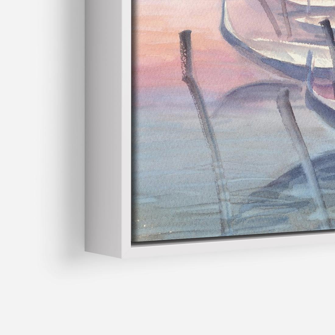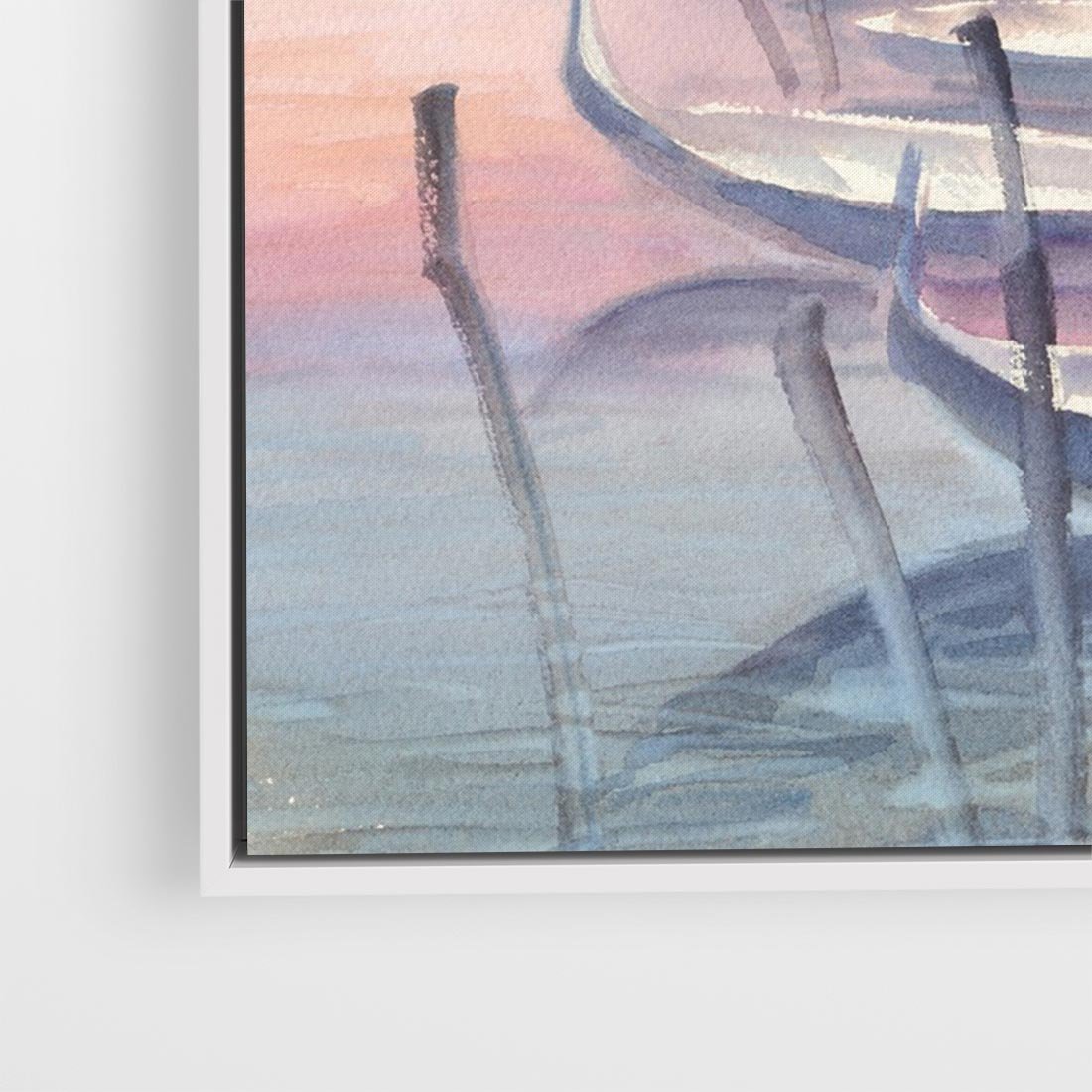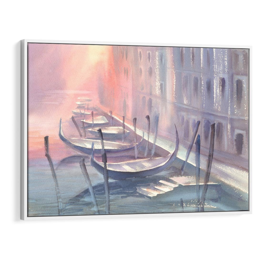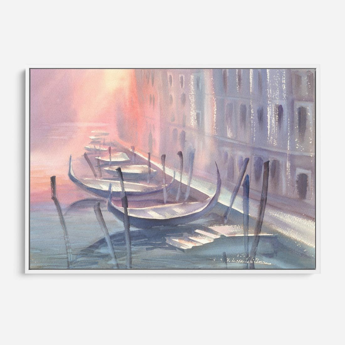Ten akwarelowy rysunek przedstawia malownicze gondole na tle weneckiego kanału podczas zachodu słońca. Stonowane pastelowe kolory tworzą romantyczną aurę, podkreślając urok i magię Wenecji. To wizja spokoju i piękna, która przenosi nas w magiczny świat włoskiej laguny i zaprasza do kontemplacji nad pięknem przyrody i architektury.