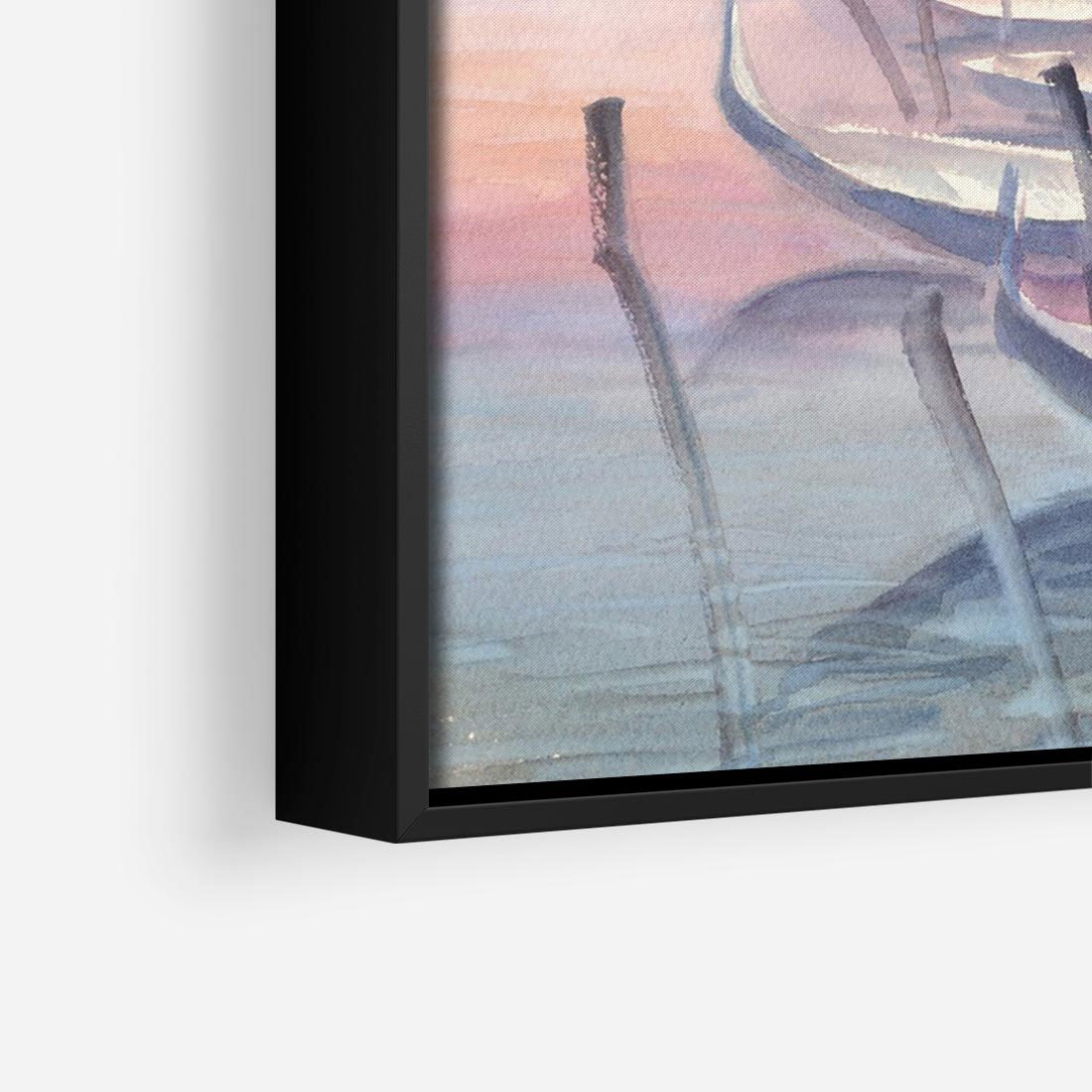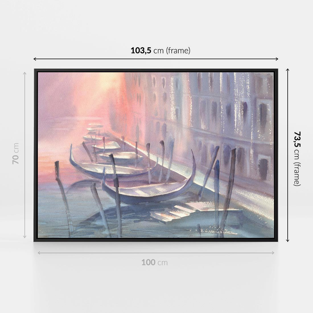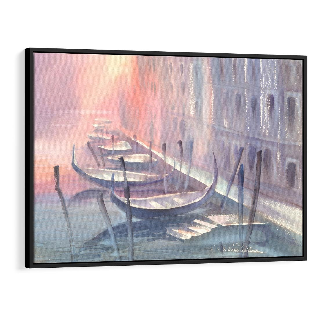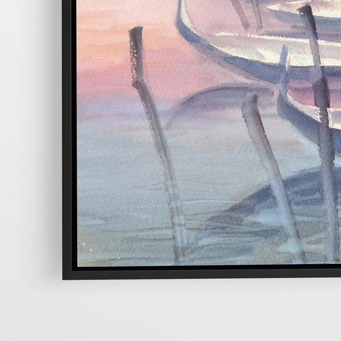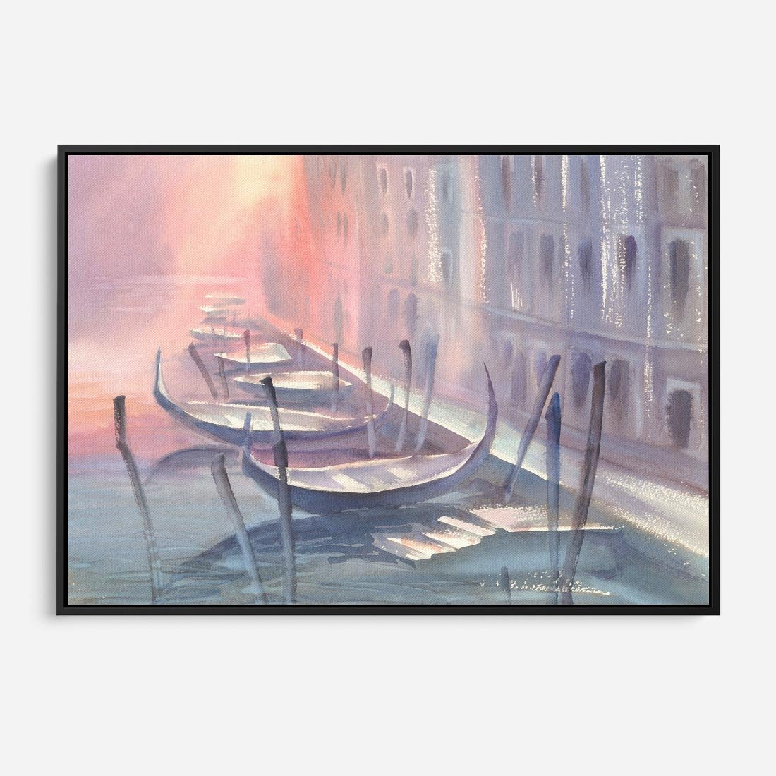 Ten akwarelowy rysunek przedstawia malownicze gondole na tle weneckiego kanału podczas zachodu słońca. Stonowane pastelowe kolory tworzą romantyczną aurę, podkreślając urok i magię Wenecji. To wizja spokoju i piękna, która przenosi nas w magiczny świat włoskiej laguny i zaprasza do kontemplacji nad pięknem przyrody i architektury.