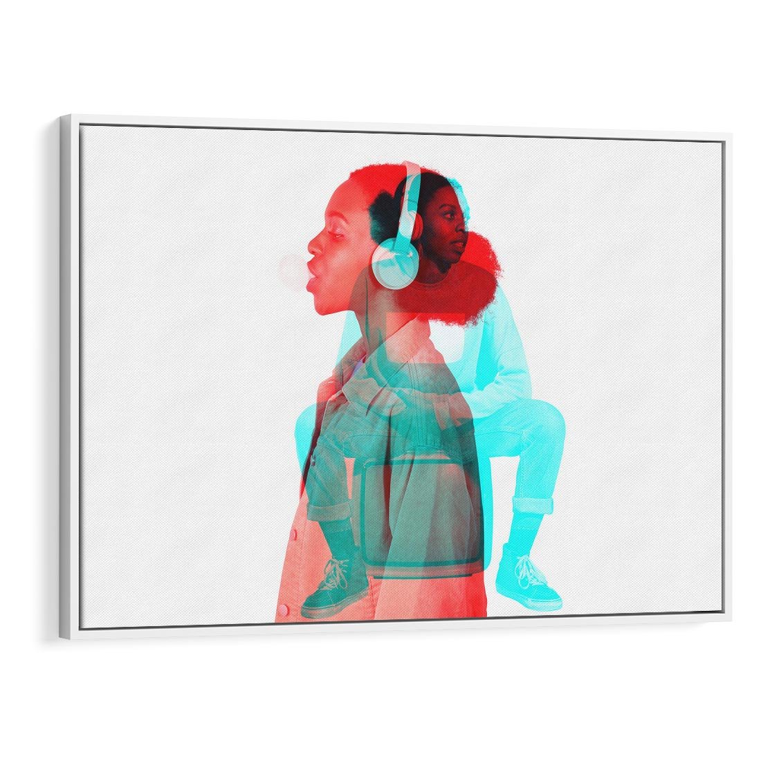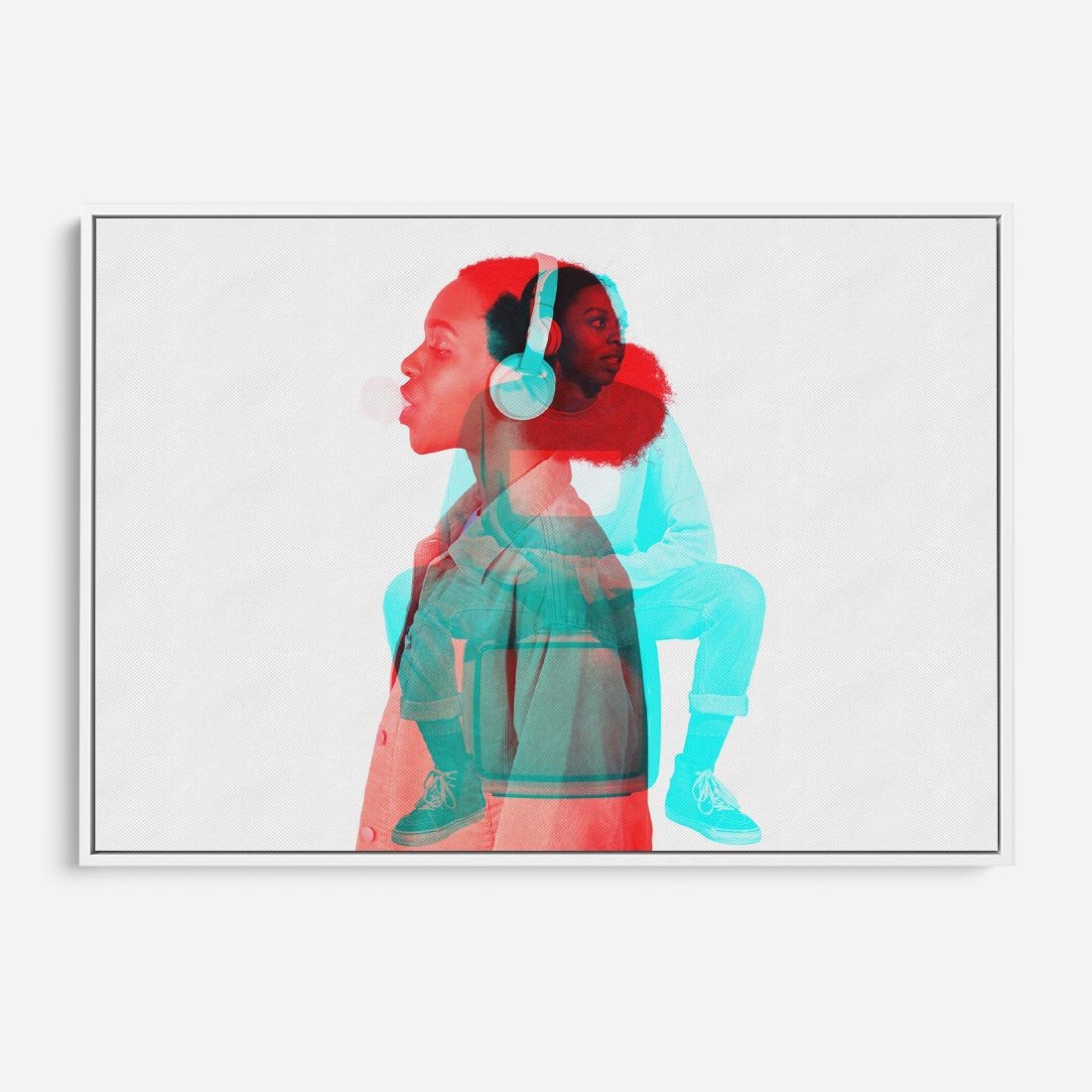 Abstrakcyjny kolaż przedstawiający kobietę w słuchawkach ukazuje fascynujący świat dźwięków i muzyki. To dzieło sztuki oddaje hołd stylowi retro, łącząc barwne zdjęcia w unikalną kompozycję, która ożywa wspomnienia i tworzy nowe emocje.
