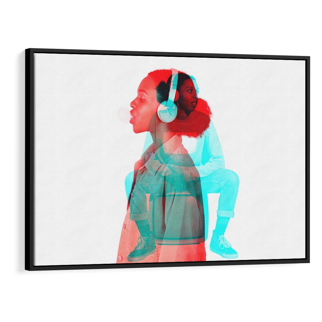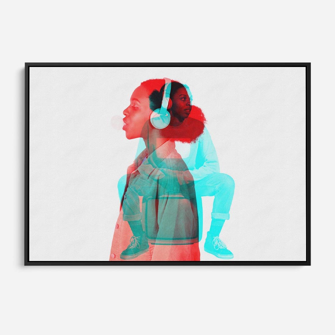 Abstrakcyjny kolaż przedstawiający kobietę w słuchawkach ukazuje fascynujący świat dźwięków i muzyki. To dzieło sztuki oddaje hołd stylowi retro, łącząc barwne zdjęcia w unikalną kompozycję, która ożywa wspomnienia i tworzy nowe emocje.