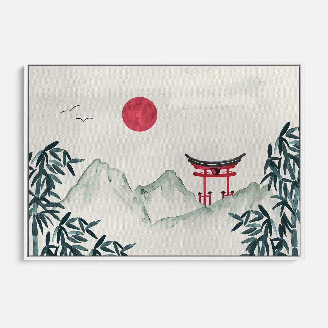Obraz w ramie 100x70 - Słońce nad Górami - japoński krajobraz, góry - rama biała