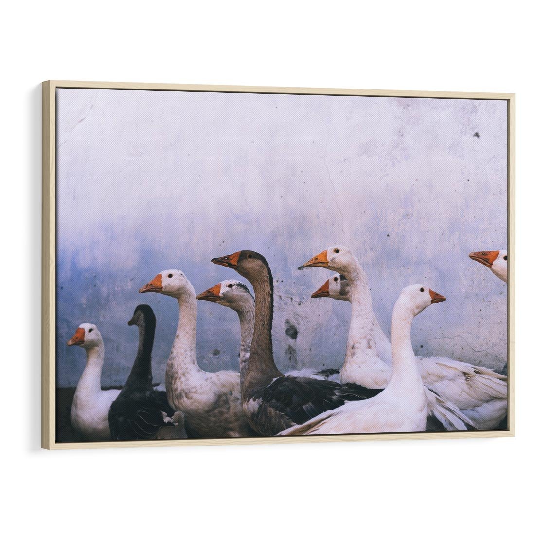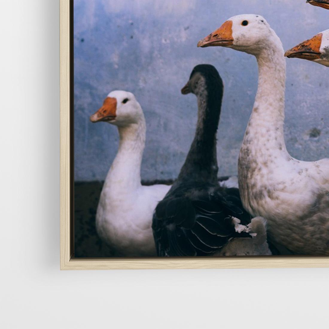 To uchwycony moment prezentujący gęsi w dwóch kontrastujących kolorach - białym i brązowym- na tle ściany. To jednocześnie prostota i głębia, które przenoszą nas w świat harmonii natury i wiejskiego krajobrazu. Obraz zachwyca swoją autentycznością, idealny dla miłośników przyrody i fotografii.