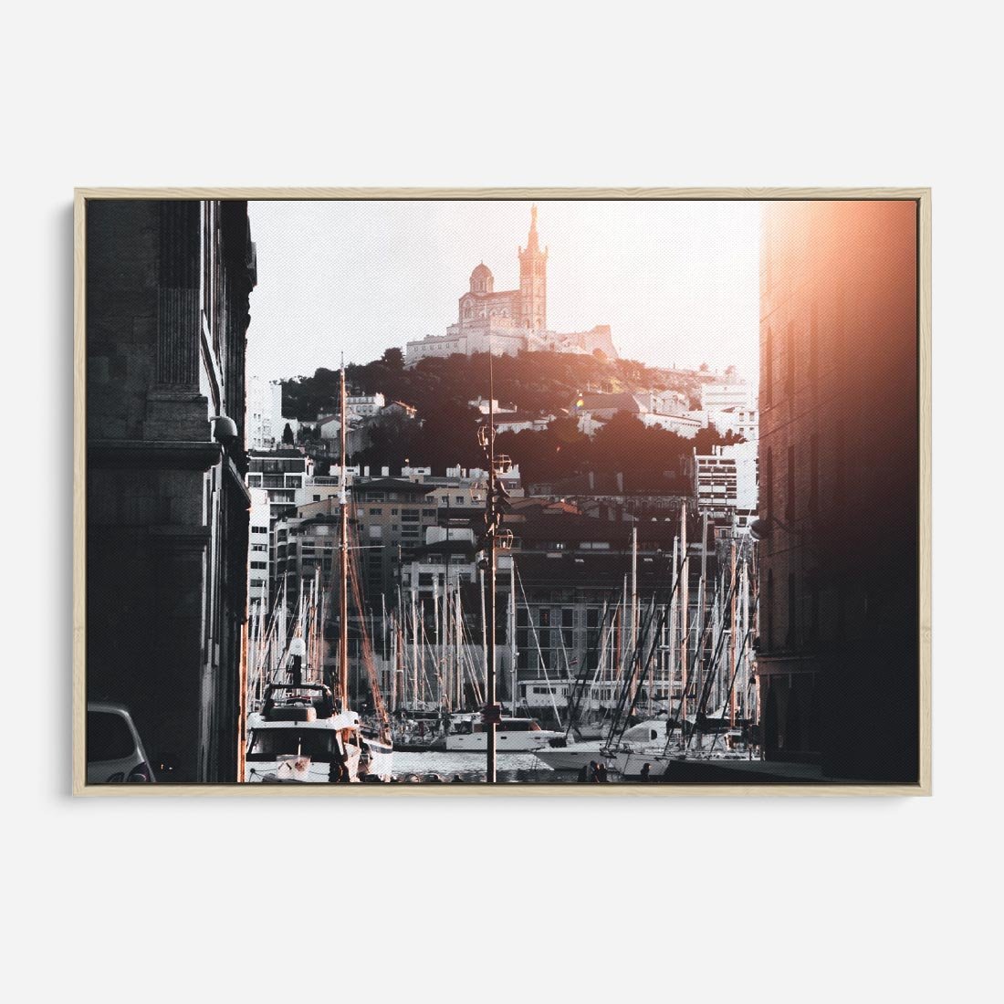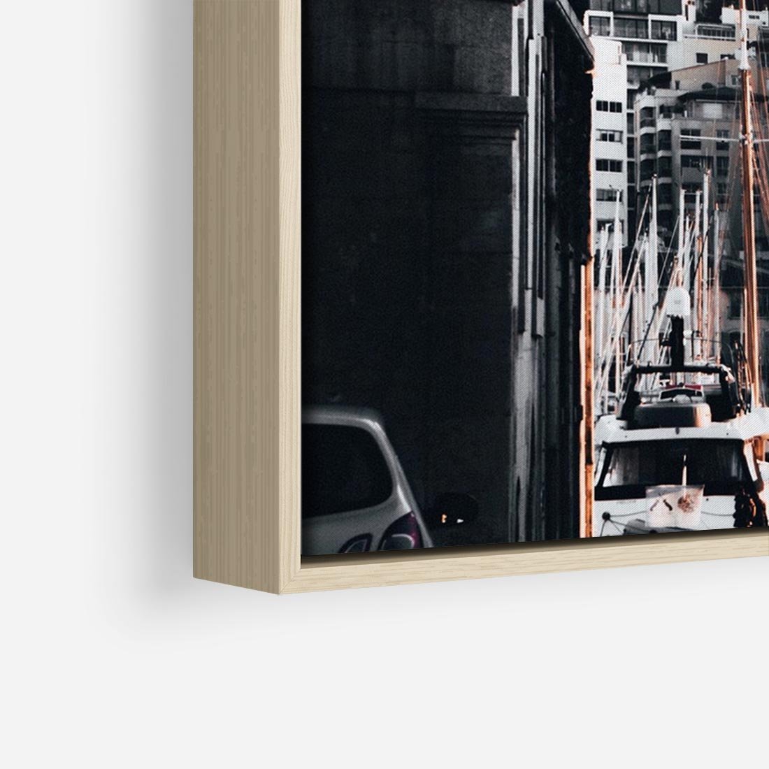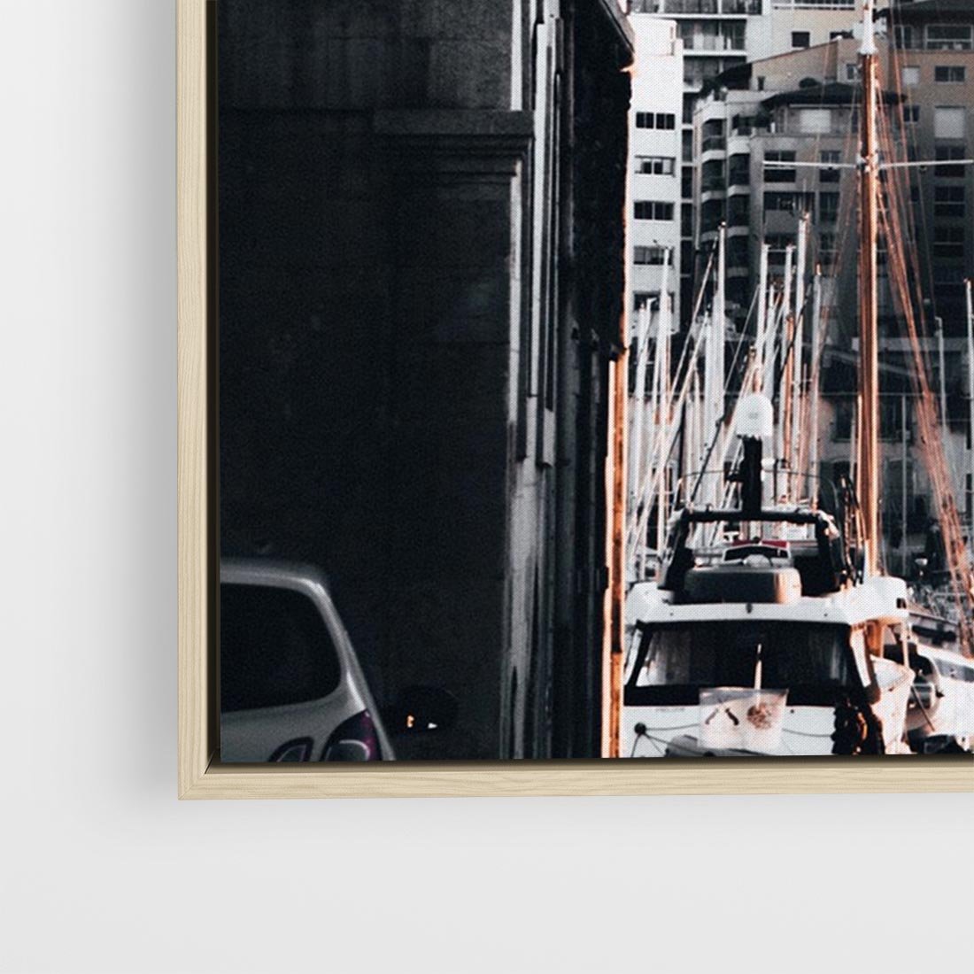 Obraz w ramie 100x70 - Światło Portowe - czarno białe zdjecie, uliczka w nadmorskim mieście - rama drewno