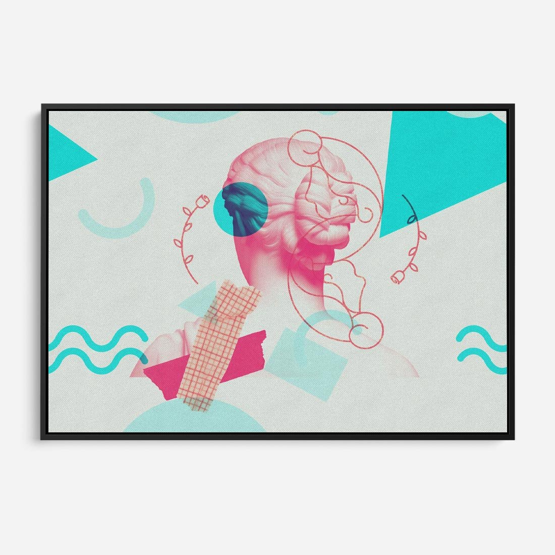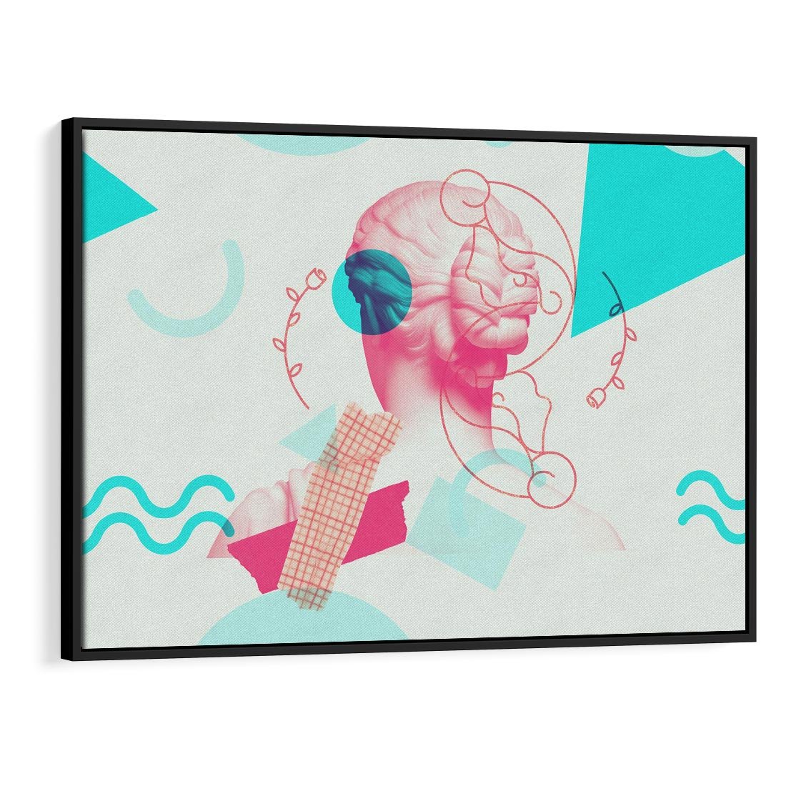Ten nowoczesny kolaż łączy antyczną rzeźbę kobiety z elementami sztuki współczesnej. W delikatnych odcieniach różowego ukazuje piękno ludzkiej formy, przenosząc je w nowoczesny kontekst. To unikalne dzieło sztuki przyciąga wzrok i inspiruje do refleksji nad pięknem i ewolucją sztuki przez wieki.