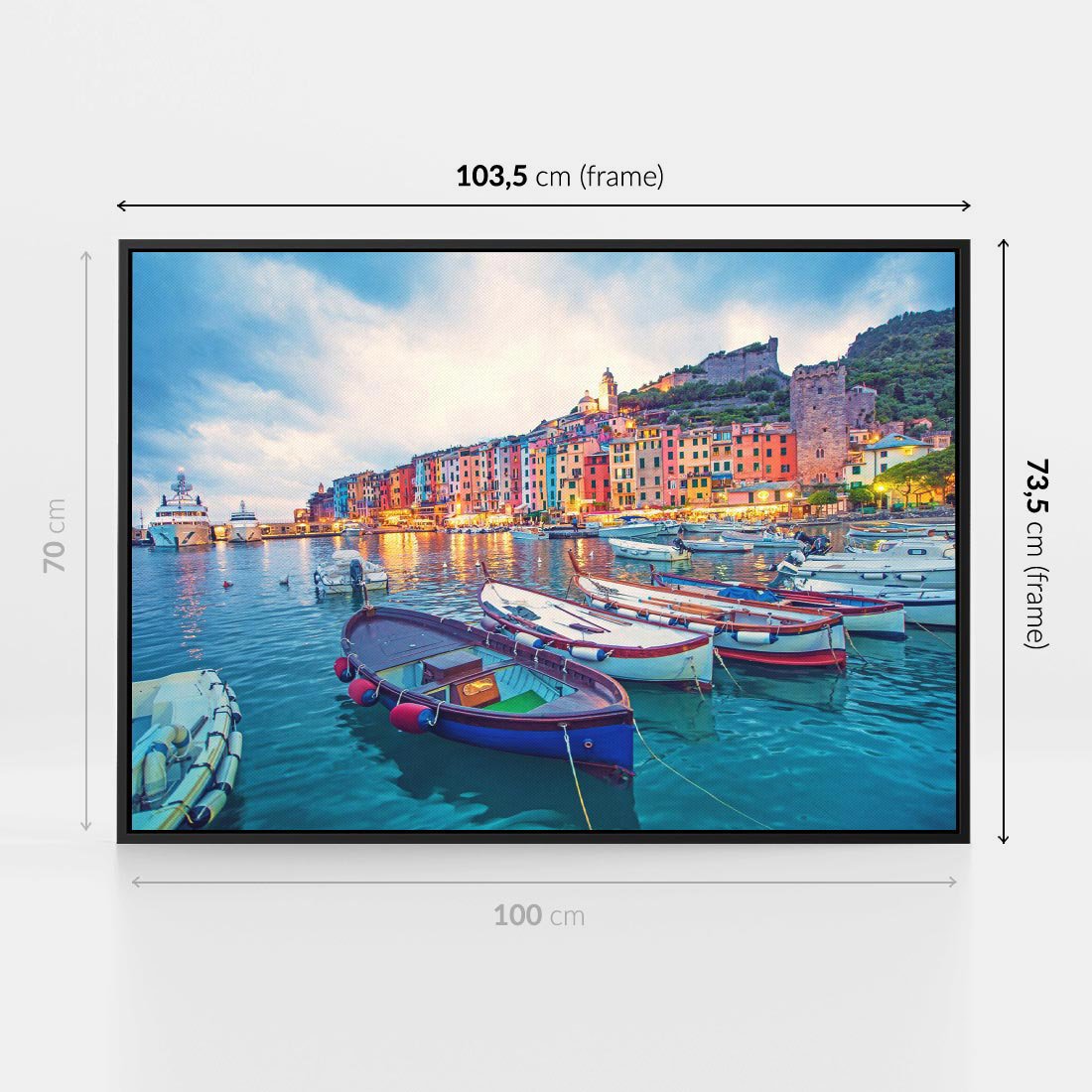 Obraz w ramie 100x70 - Tańczące kolory zachodu - nadmorskie kolorowe miast, kolorowe budynki na brzegu - rama czarna