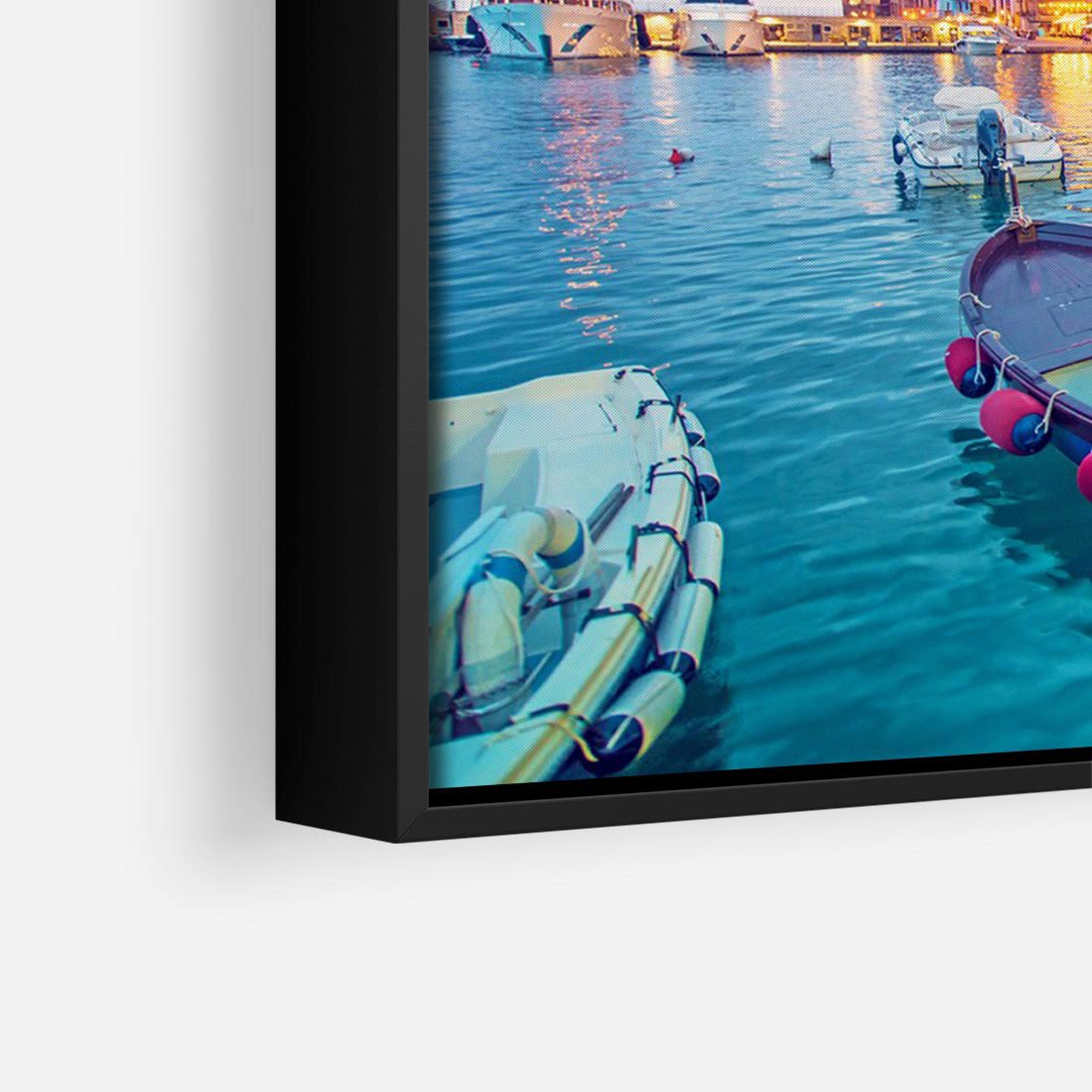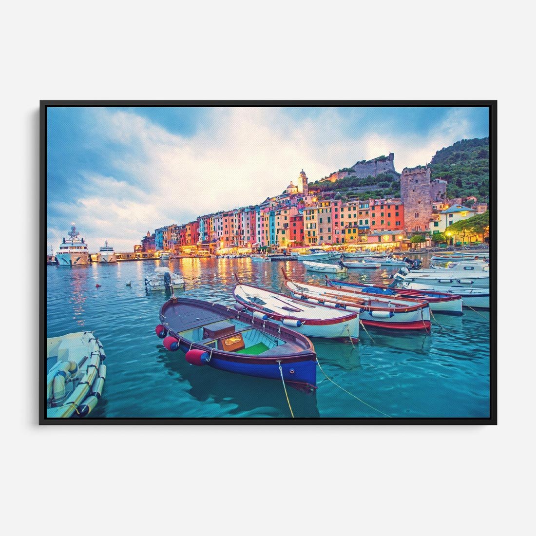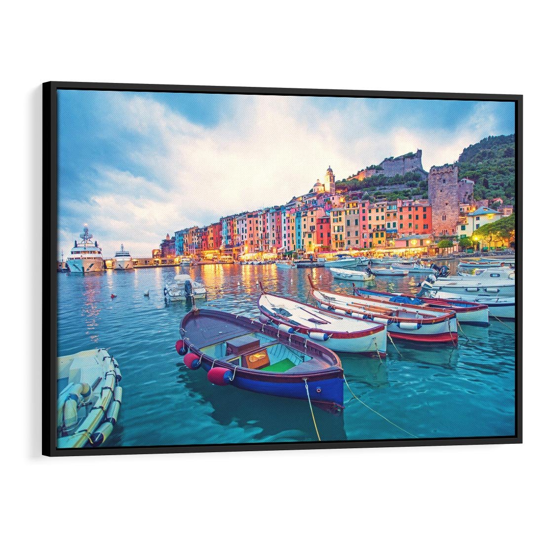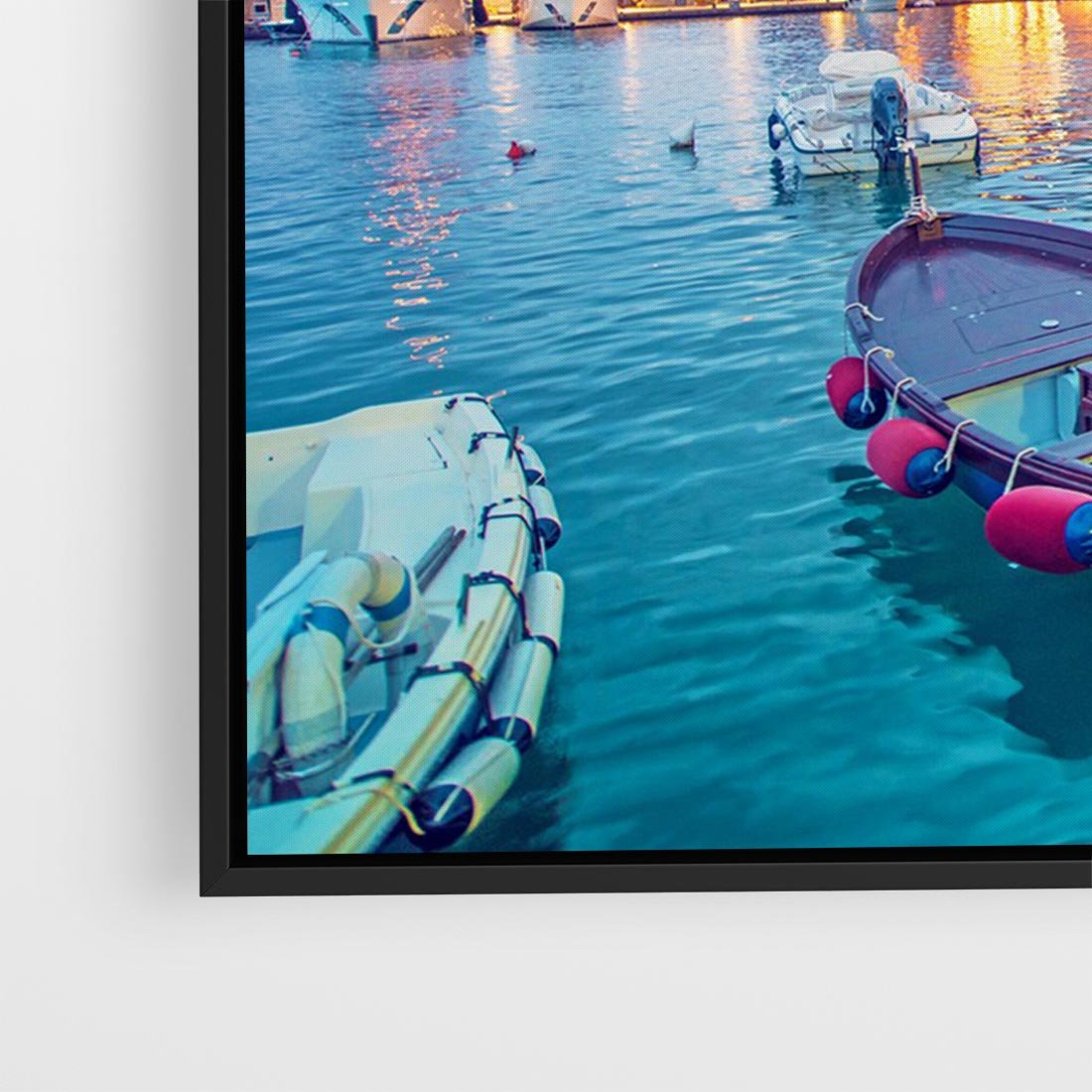 To malowniczy pejzaż przedstawiający nadmorskie miasto ożywione bogatą paletą barw. Budynki w jaskrawych kolorach zdobią brzeg, a port tętni życiem z kolorowymi łodziami. Wieczorne latarnie rozświetlają to idylliczne miejsce, nadając mu romantyczny nastrój. Ten obraz przenosi widza w magiczny krajobraz pełen kolorów i uroku nadmorskiego miasteczka. Idealny dla miłośników podróży i pięknych widoków.