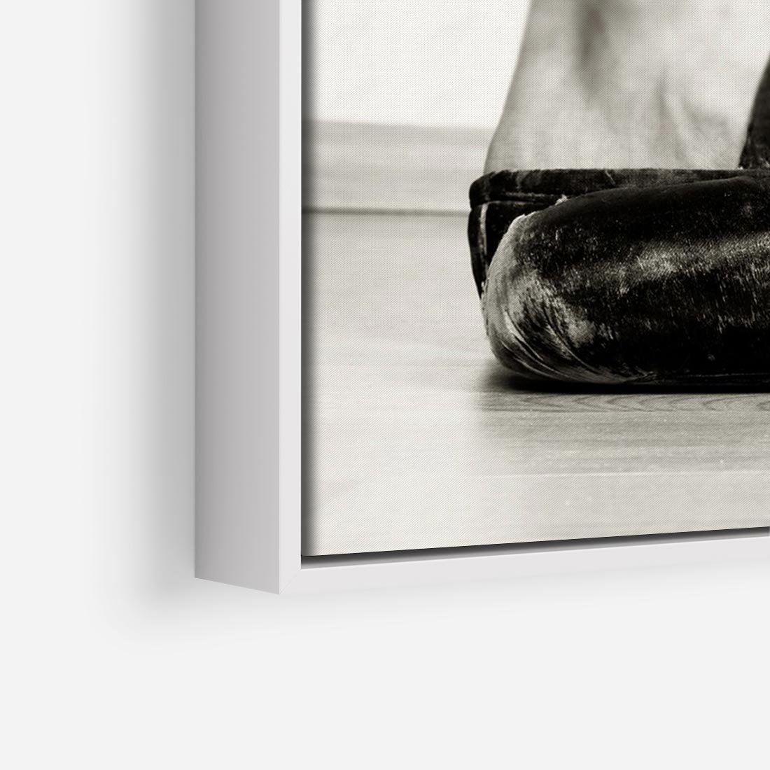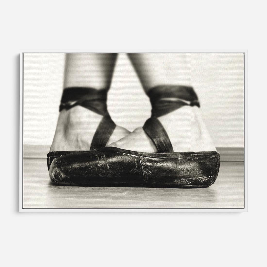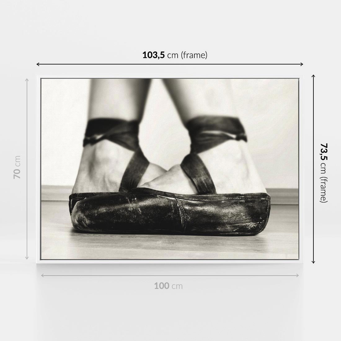 Ta czarno-biała fotografia uchwyciła piękno i delikatność baletnicy w bliskim zbliżeniu na jej stopy. W czarnych zabrudzonych baletkach widać wytrzymałość i poświęcenie dla tańca. Monochromatyczna paleta podkreśla klasykę i elegancję tego momentu, tworząc wyjątkową i pełną emocji kompozycję.