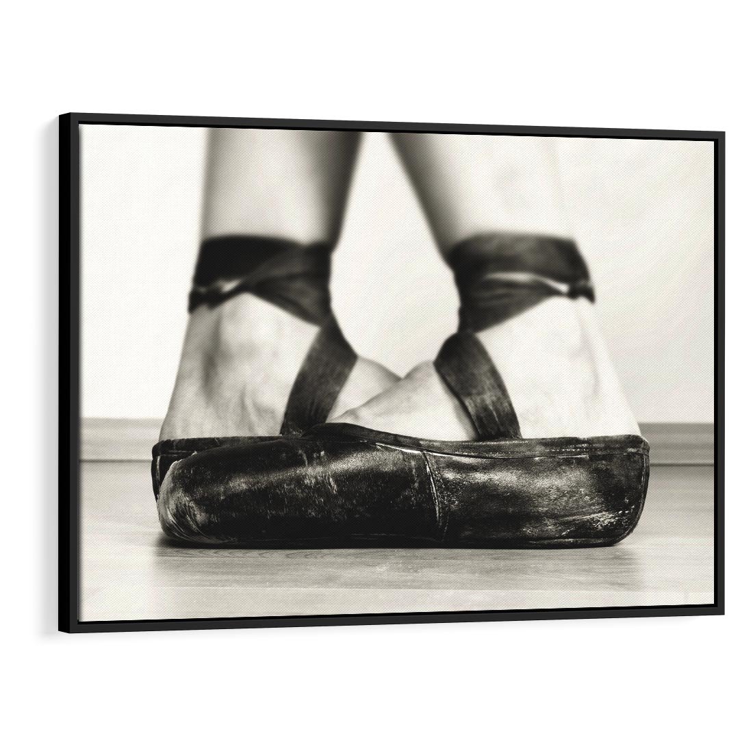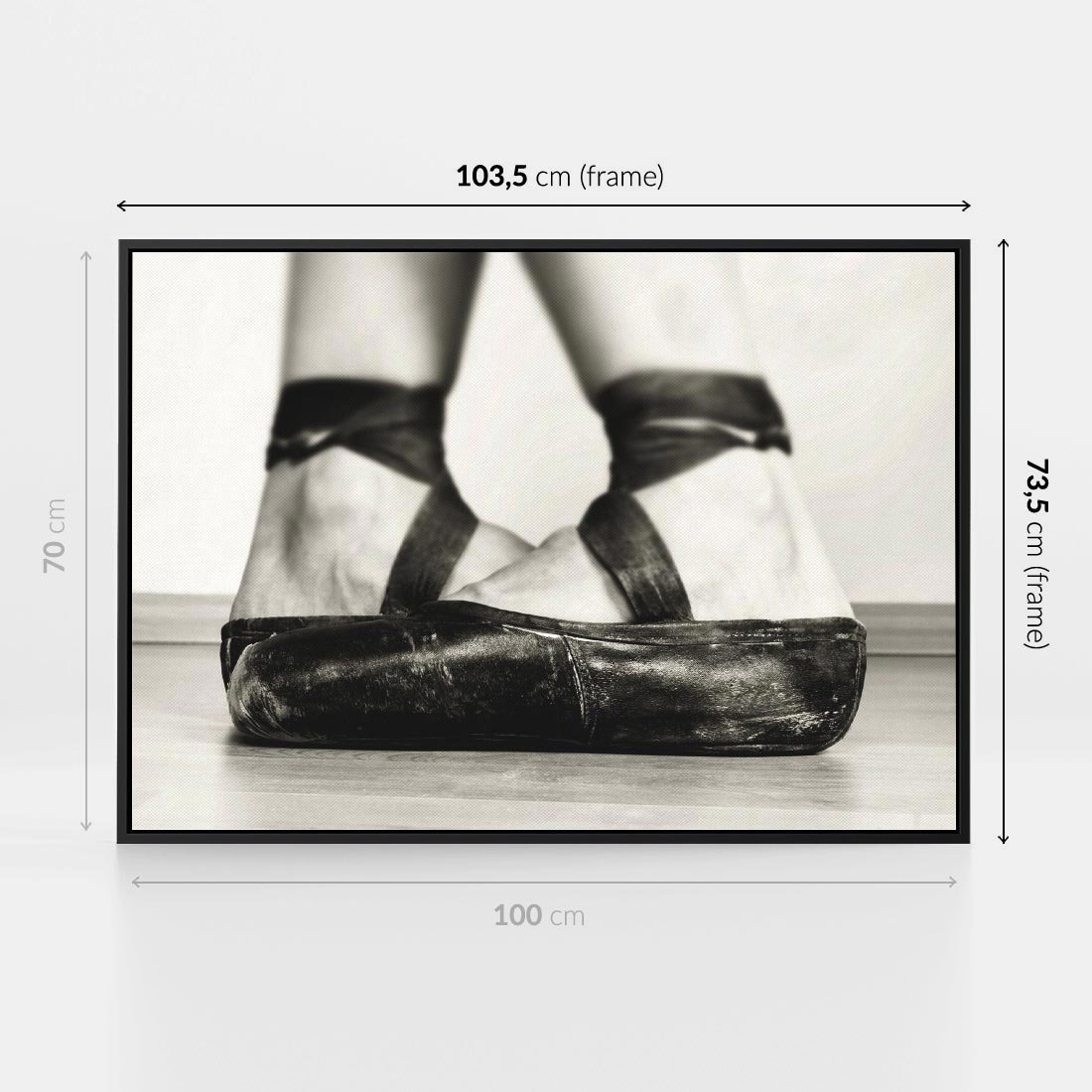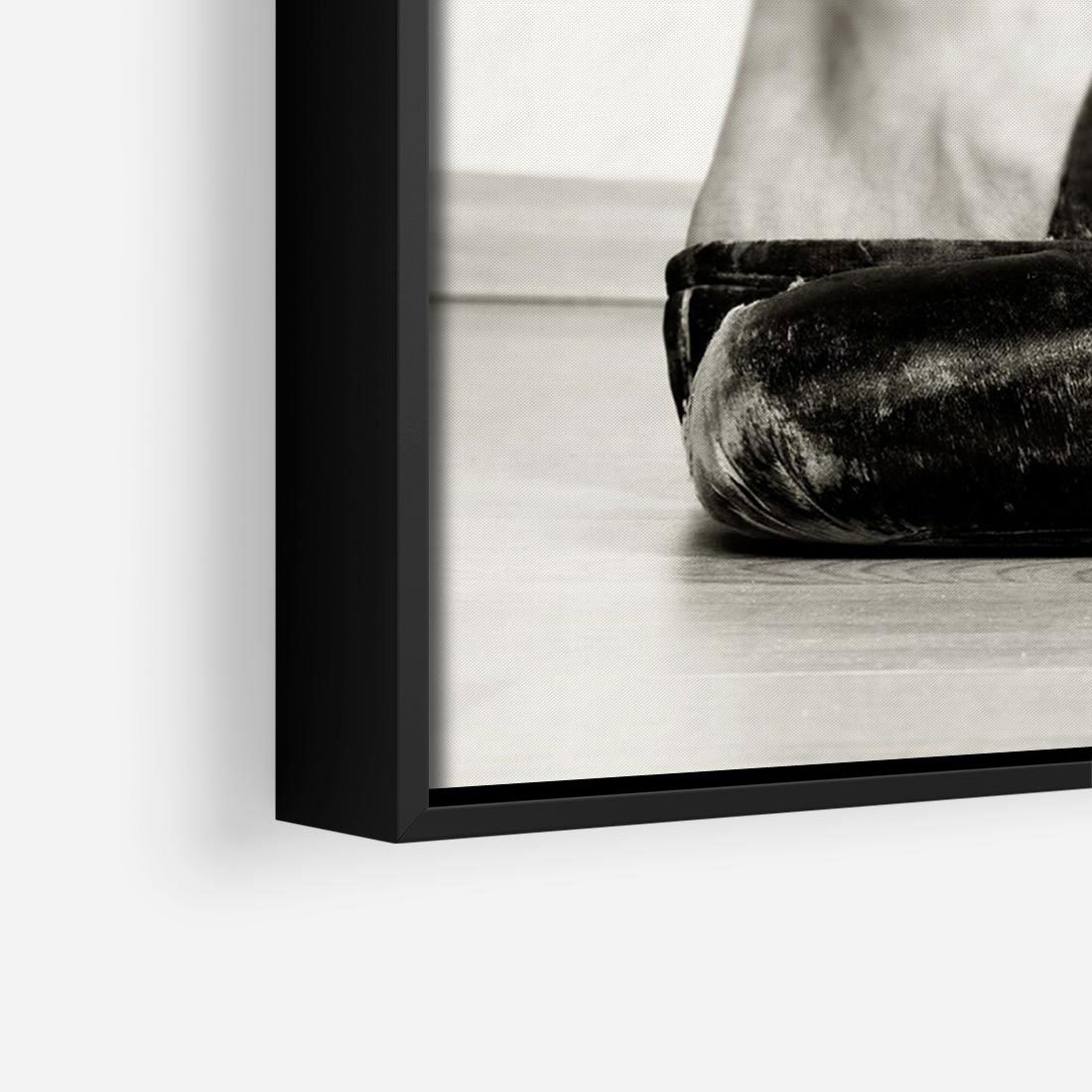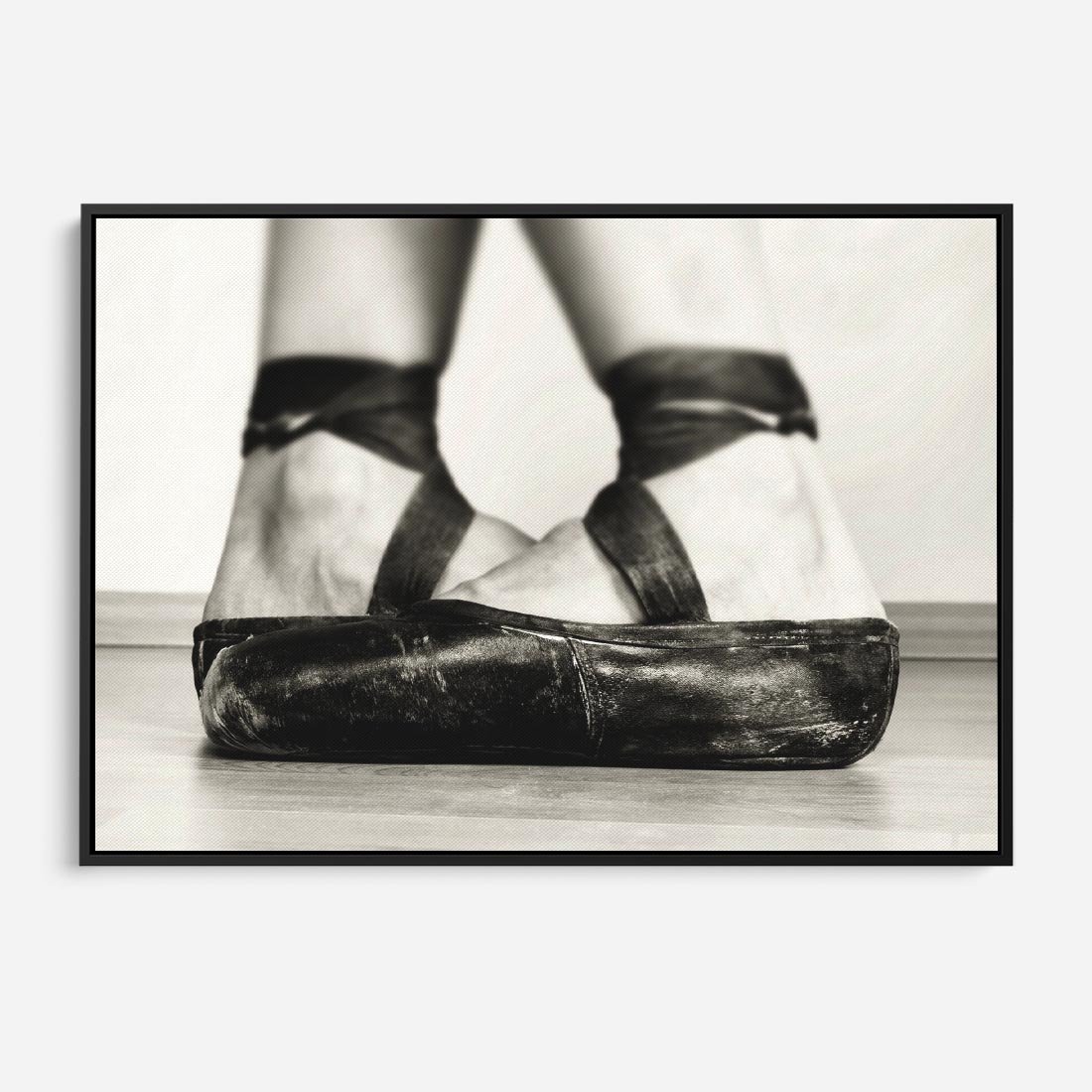 Ta czarno-biała fotografia uchwyciła piękno i delikatność baletnicy w bliskim zbliżeniu na jej stopy. W czarnych zabrudzonych baletkach widać wytrzymałość i poświęcenie dla tańca. Monochromatyczna paleta podkreśla klasykę i elegancję tego momentu, tworząc wyjątkową i pełną emocji kompozycję.