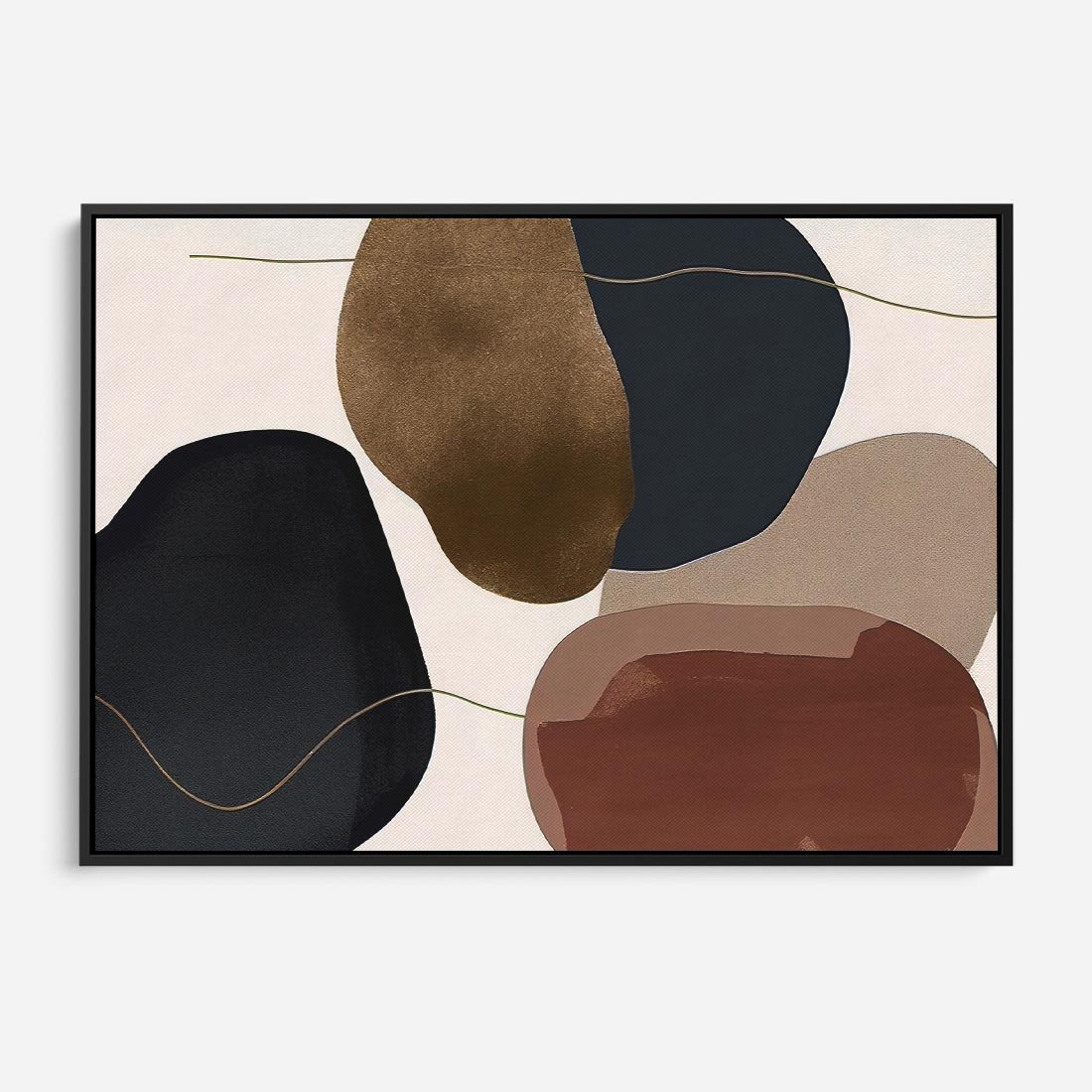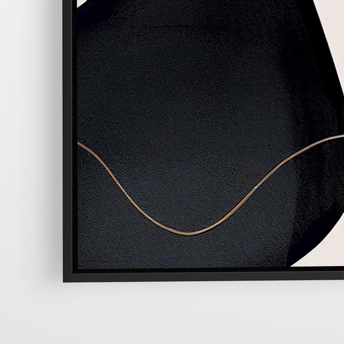 Odkryj abstrakcyjny obraz z nieregularnymi plamami w czarnym, złotym i brązowym na beżowym tle. Złote linie kreski dodają elegancji. Dla miłośników sztuki poszukujących wyjątkowych dzieł do nowoczesnych i klasycznych wnętrz.