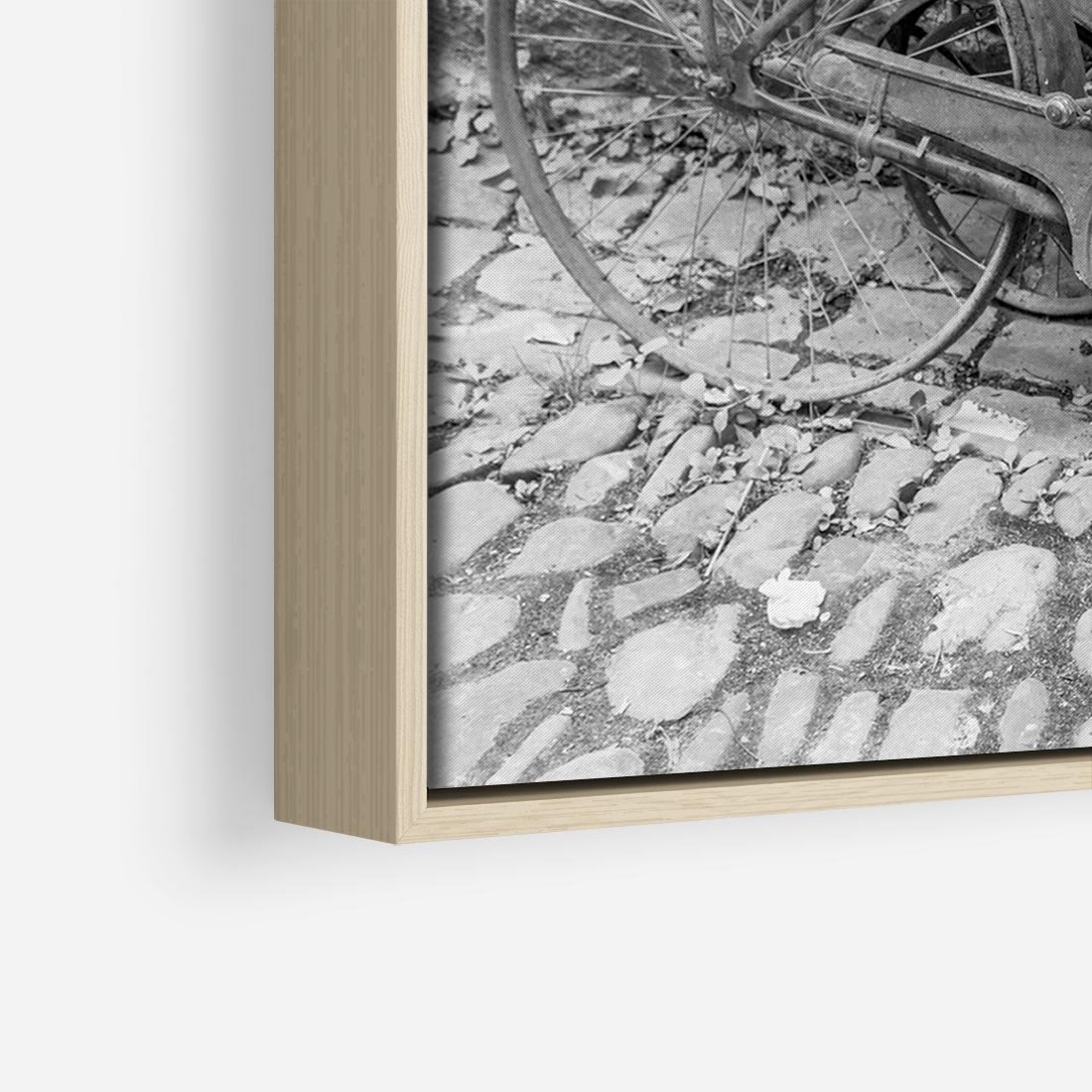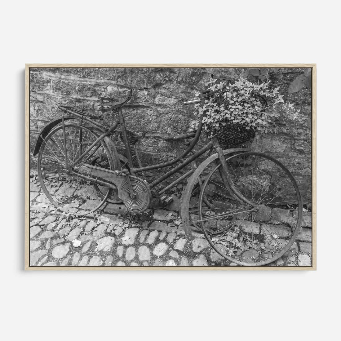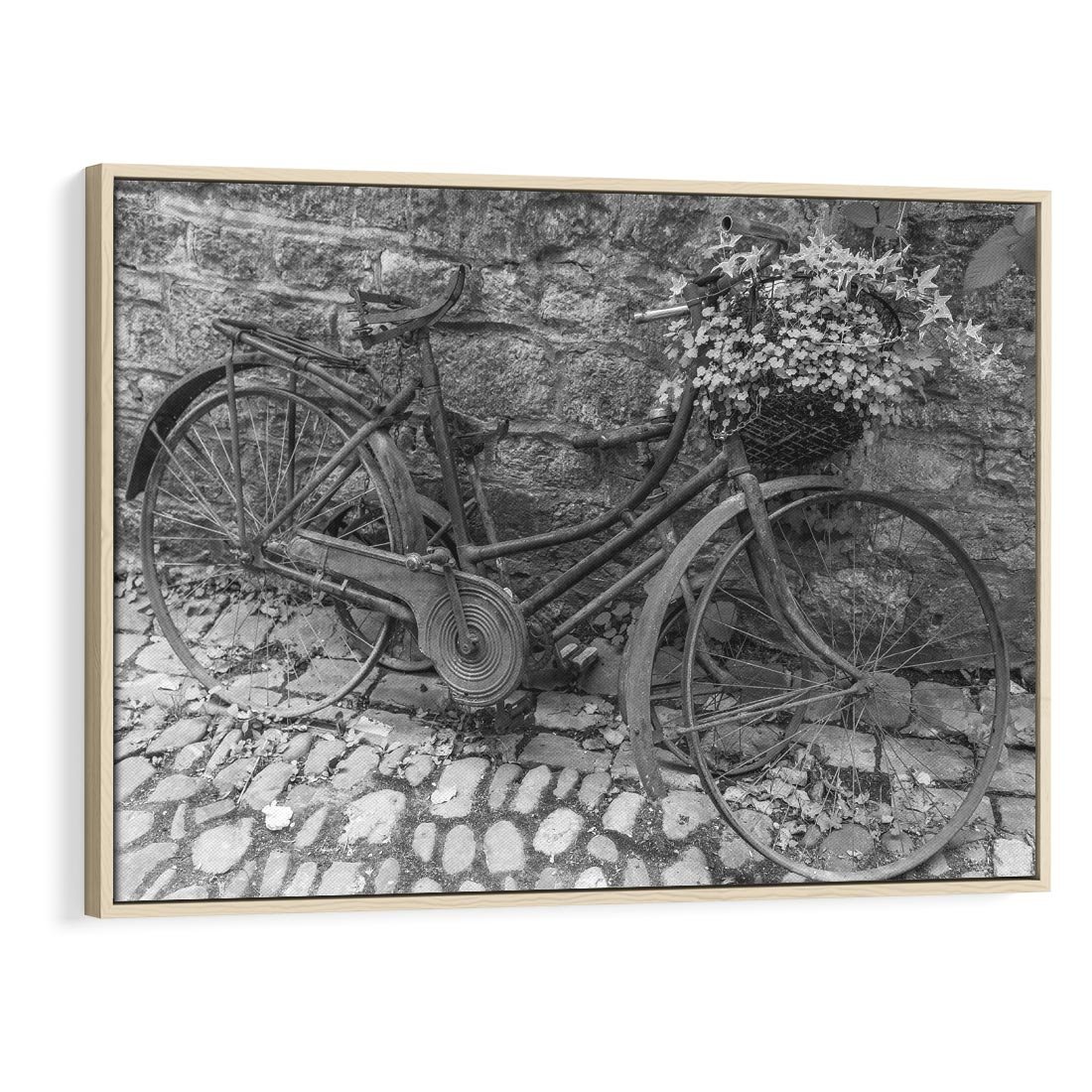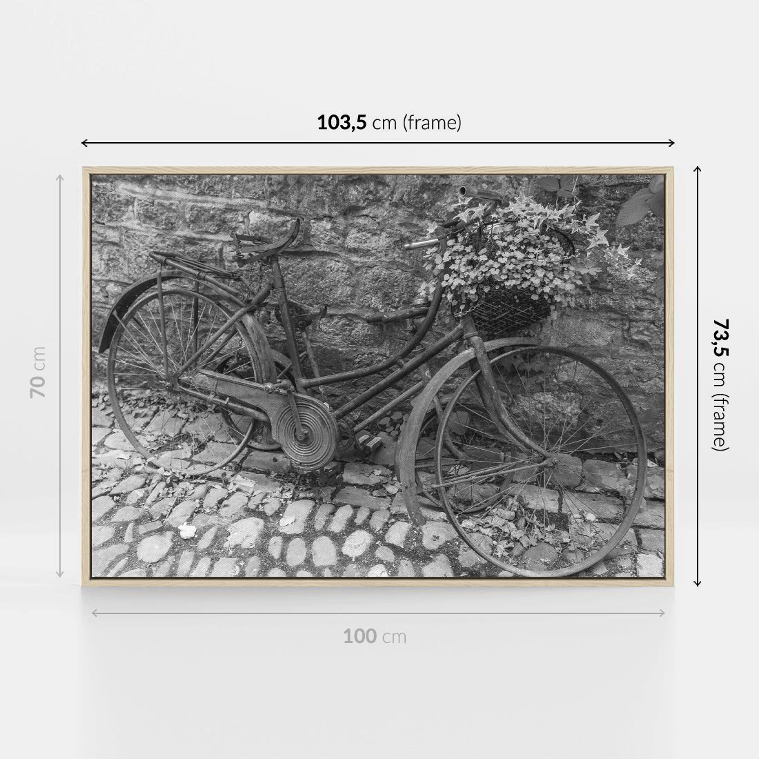 Obraz w ramie 100x70 - Zapomniany Urok - czarno biała fotografia, stary rower oparty o mur - rama drewno
