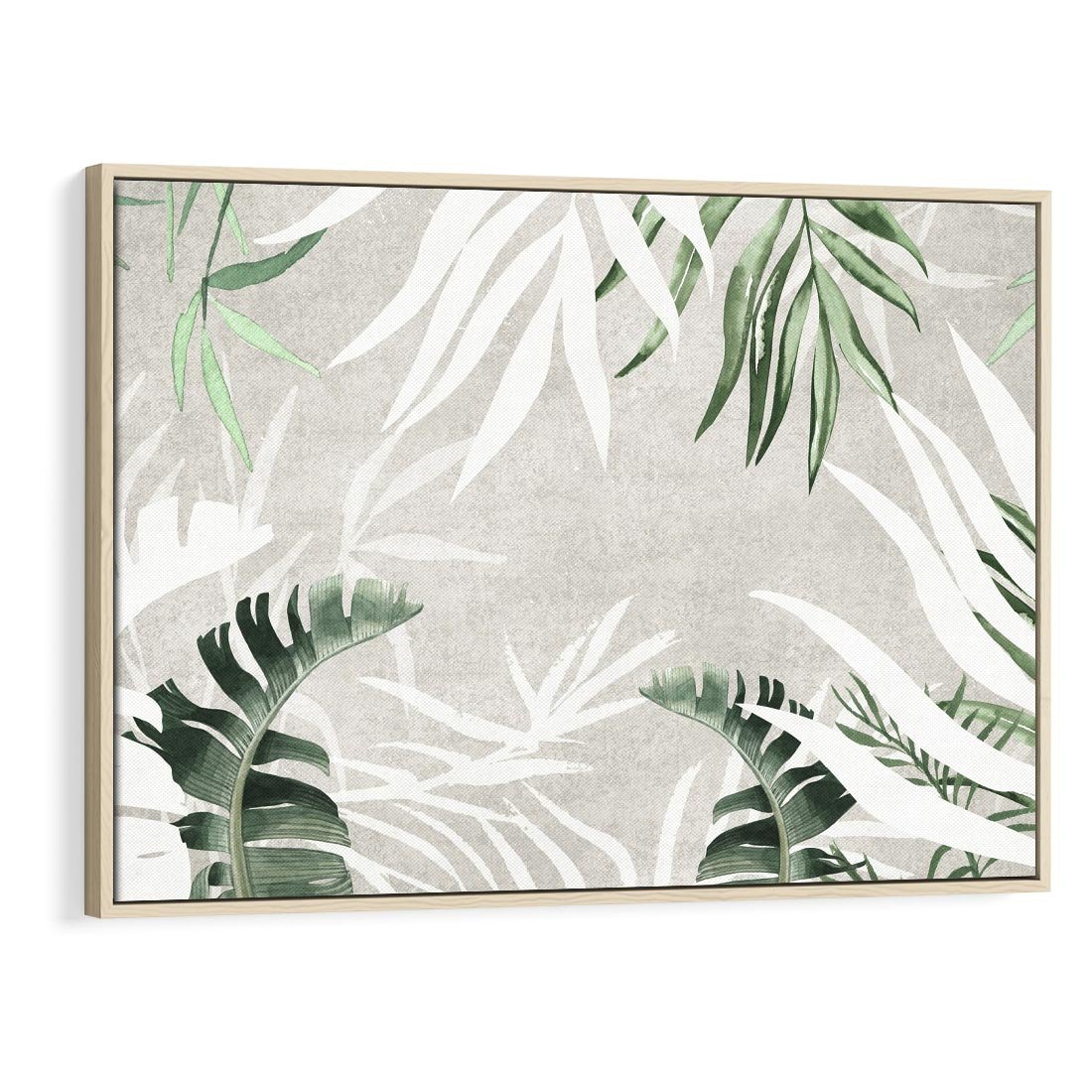 Ten obraz ukazuje tropikalne liście monstery i palm, otulone w bogactwo zieleni i neutralnych barw. Kompozycja emanuje egzotycznym urokiem, przyciągając wzrok swoją roślinną pięknością. To wyjątkowe dzieło sztuki wprowadzi do przestrzeni świeżość natury i spokojną harmonię, idealne dla miłośników tropikalnych akcentów i minimalistycznego designu.