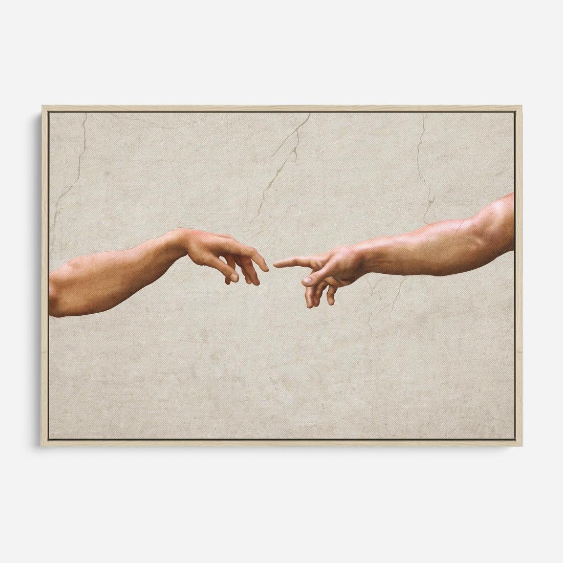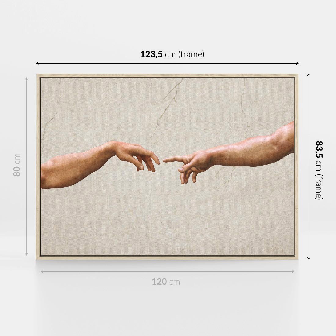 Ten wyjątkowy obraz stanowi hołd dla sztuki antyku i Michała Anioła. Ukazuje chwile Stworzenia Adama, gdzie ręka Boga dotyka ludzkiej dłoni. Wyrazista kompozycja i mistyczna atmosfera przyciągają wzrok i inspirują do refleksji nad siłą ducha i piękna boskiej twórczości.