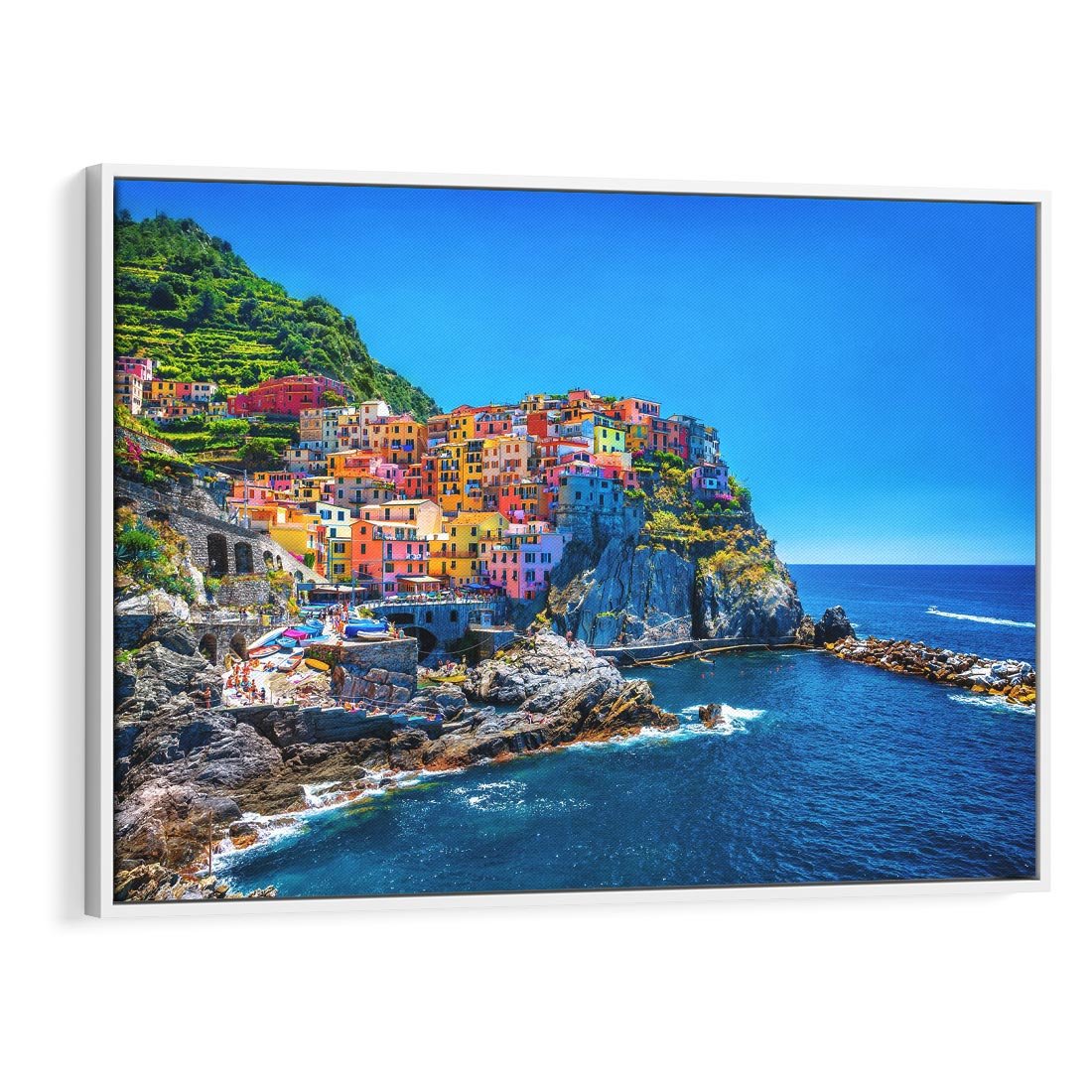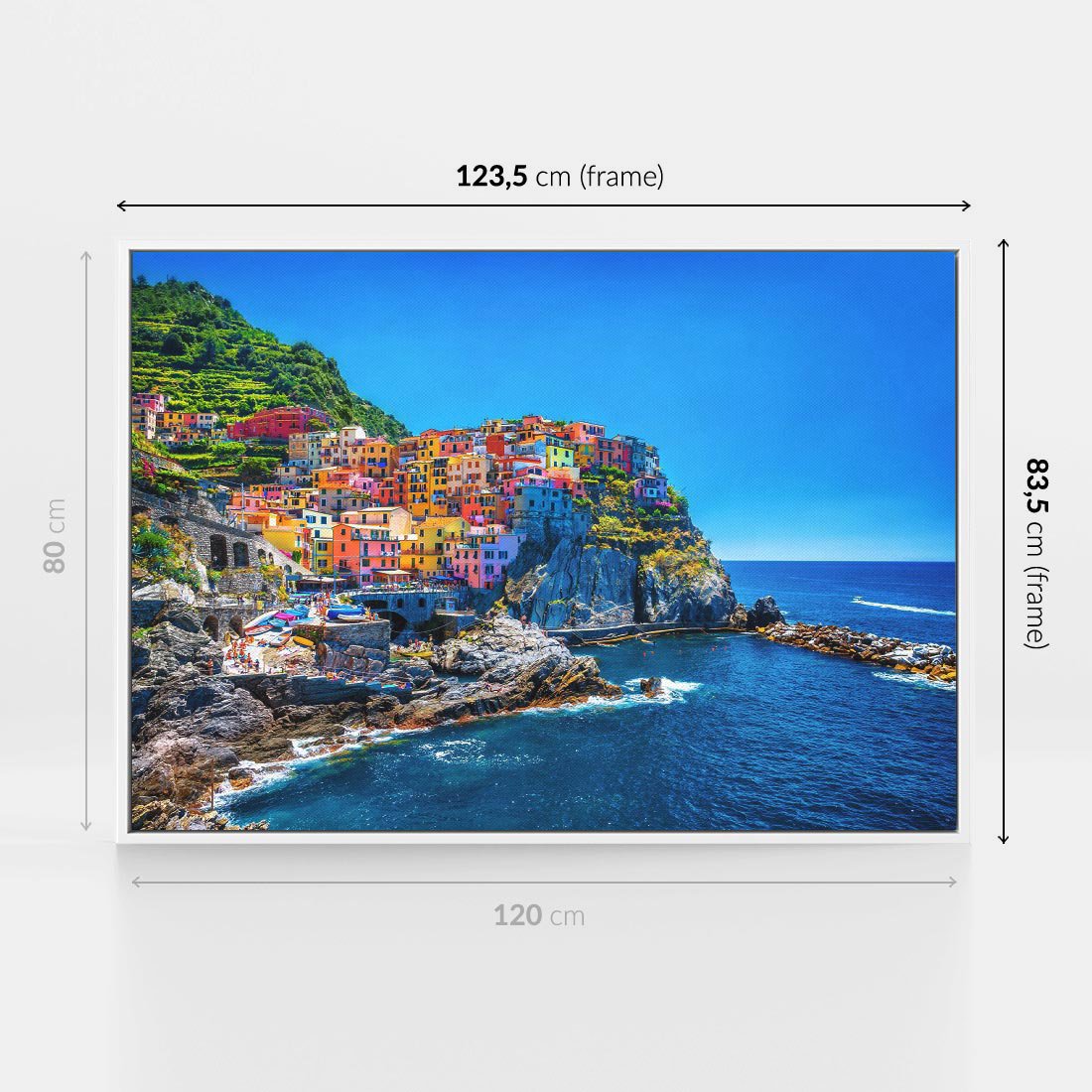 Obraz w ramie 120x80 - Barwne Wybrzeże - nadmorskie miasto na klifie, kolorowe tęczowe budynki - rama biała