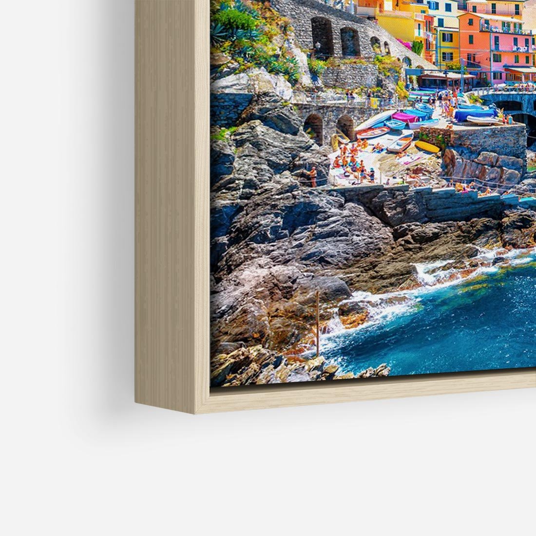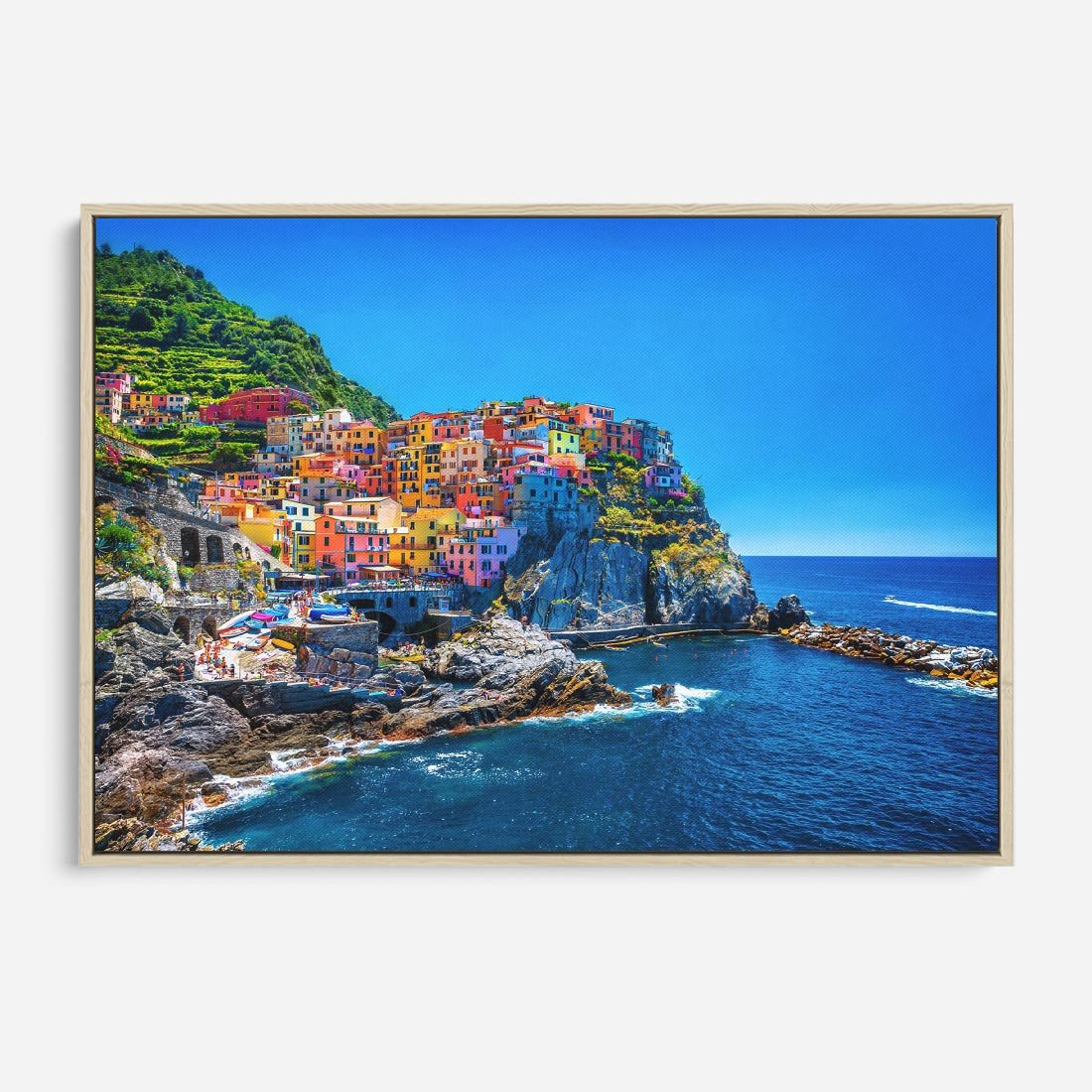 Obraz w ramie 120x80 - Barwne Wybrzeże - nadmorskie miasto na klifie, kolorowe tęczowe budynki - rama drewno