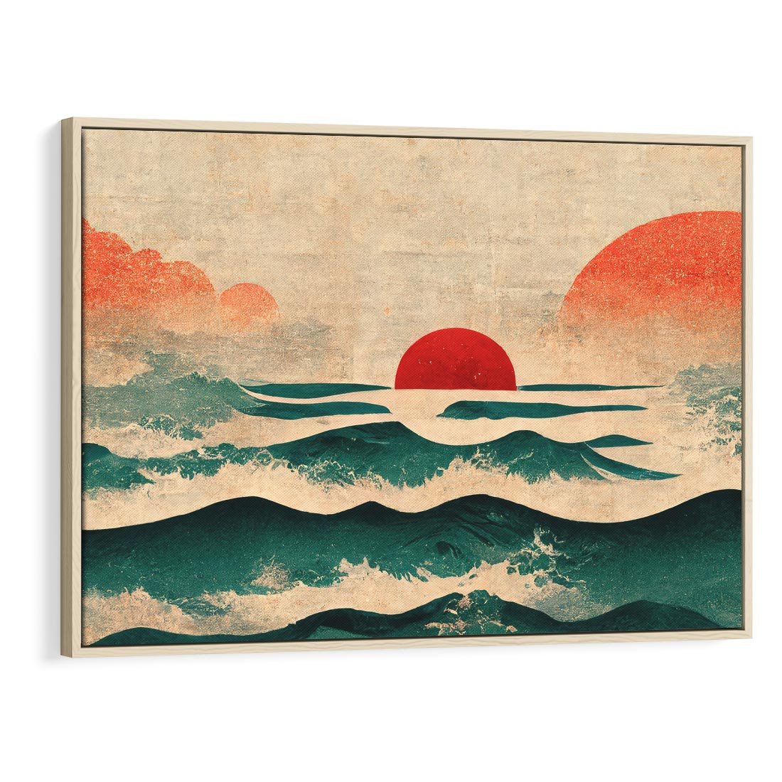 Japońska sztuka na płótnie, która przenosi nas w świat spokoju i harmonii. Widok zachodu słońca nad oceanem malowany na starym papirusie emanuje mistycznym urokiem. Styl japandi, charakteryzujący się minimalistycznym pięknem, doskonale współgra z dynamiką fal. Czerwone słońce nadaje obrazowi wyjątkowego nastroju, przenosząc nas w pejzaż dalekiej Japonii. To dzieło sztuki, które oczarowuje i zachwyca.