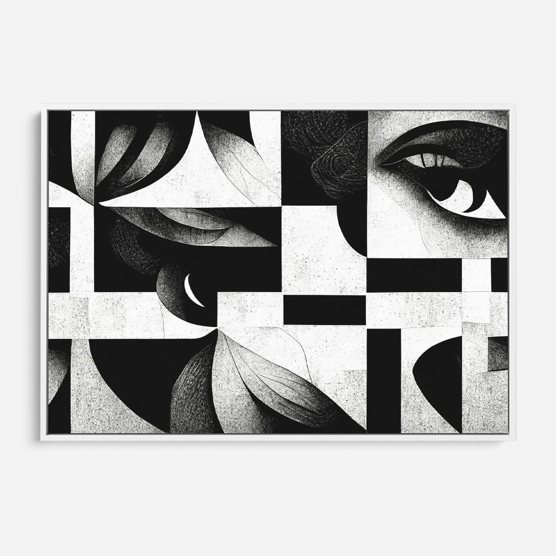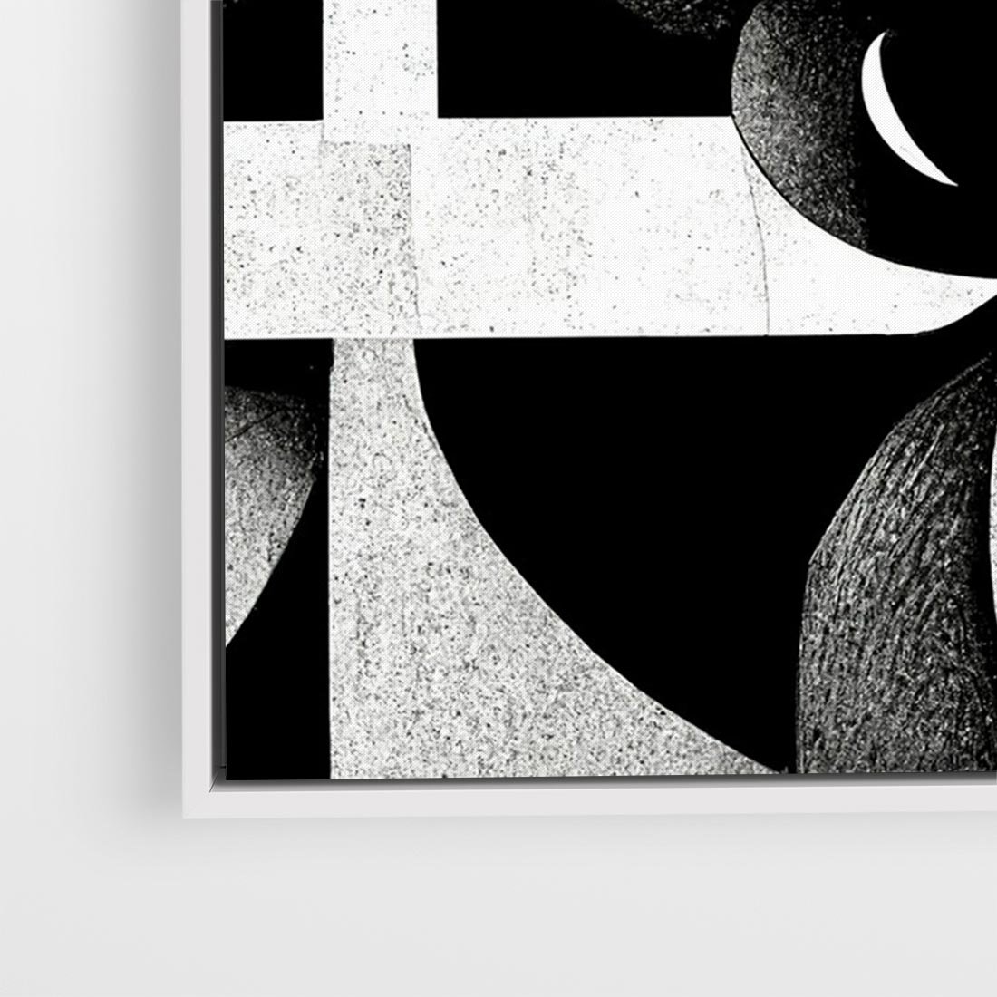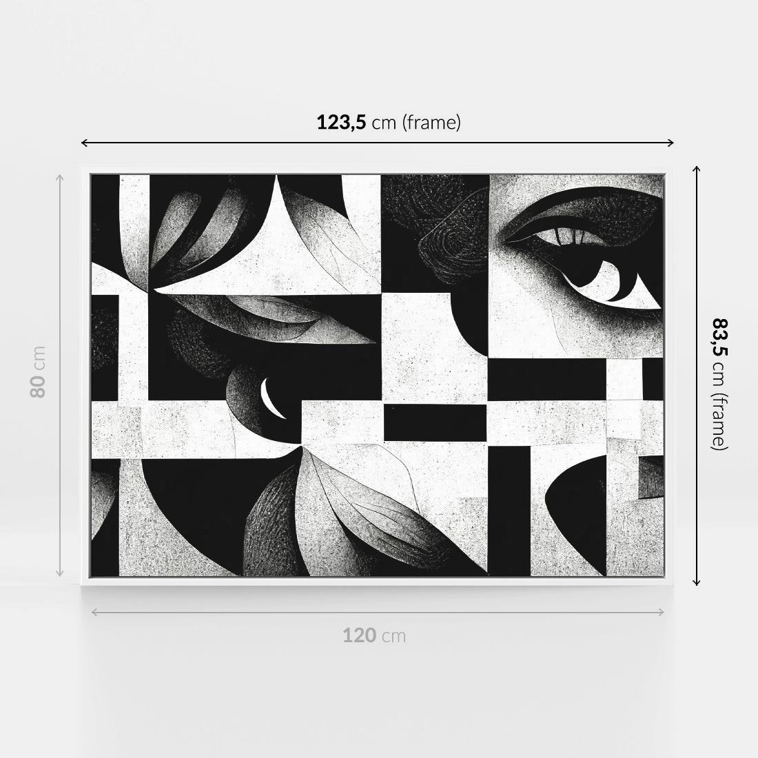Wzorowana na modernistycznym stylu, abstrakcyjna kompozycja w czerni i bieli przyciąga uwagę. Geometria i elementy roślin tworzą harmonię kontrastów, a ukryte oko dodaje tajemniczości. To dzieło sztuki o loftowym charakterze, które wprowadzi eklektyczny powiew do Twojego wnętrza.