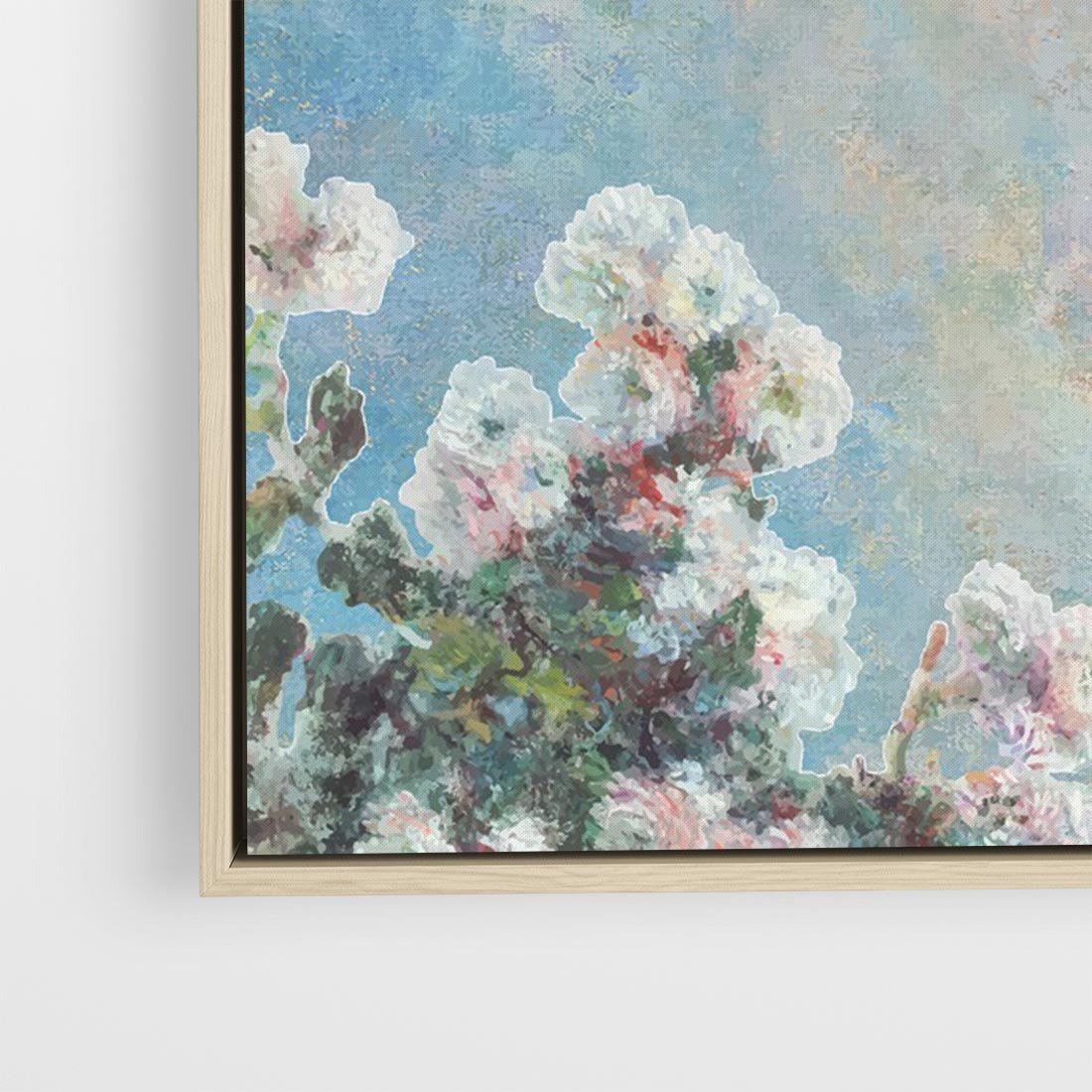 Ten subtelny obraz olejny przedstawia minimalistyczny układ, gdzie kwiaty delikatnie ukazują się w rogach pastelowego tła. To wyraz subtelności i spokoju, gdzie rośliny wiodą nas przez sielski krajobraz natury, pozostawiając główną rolę ich pięknu.