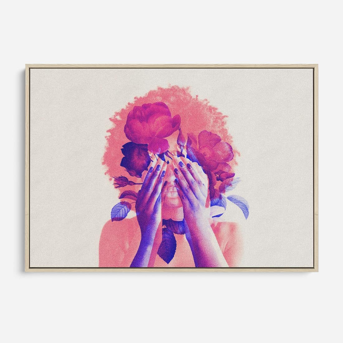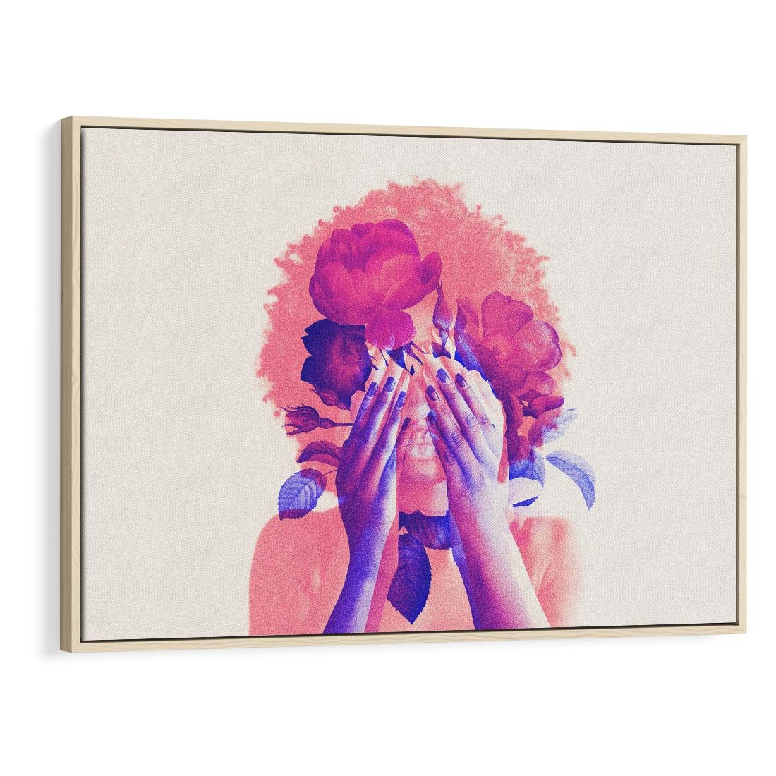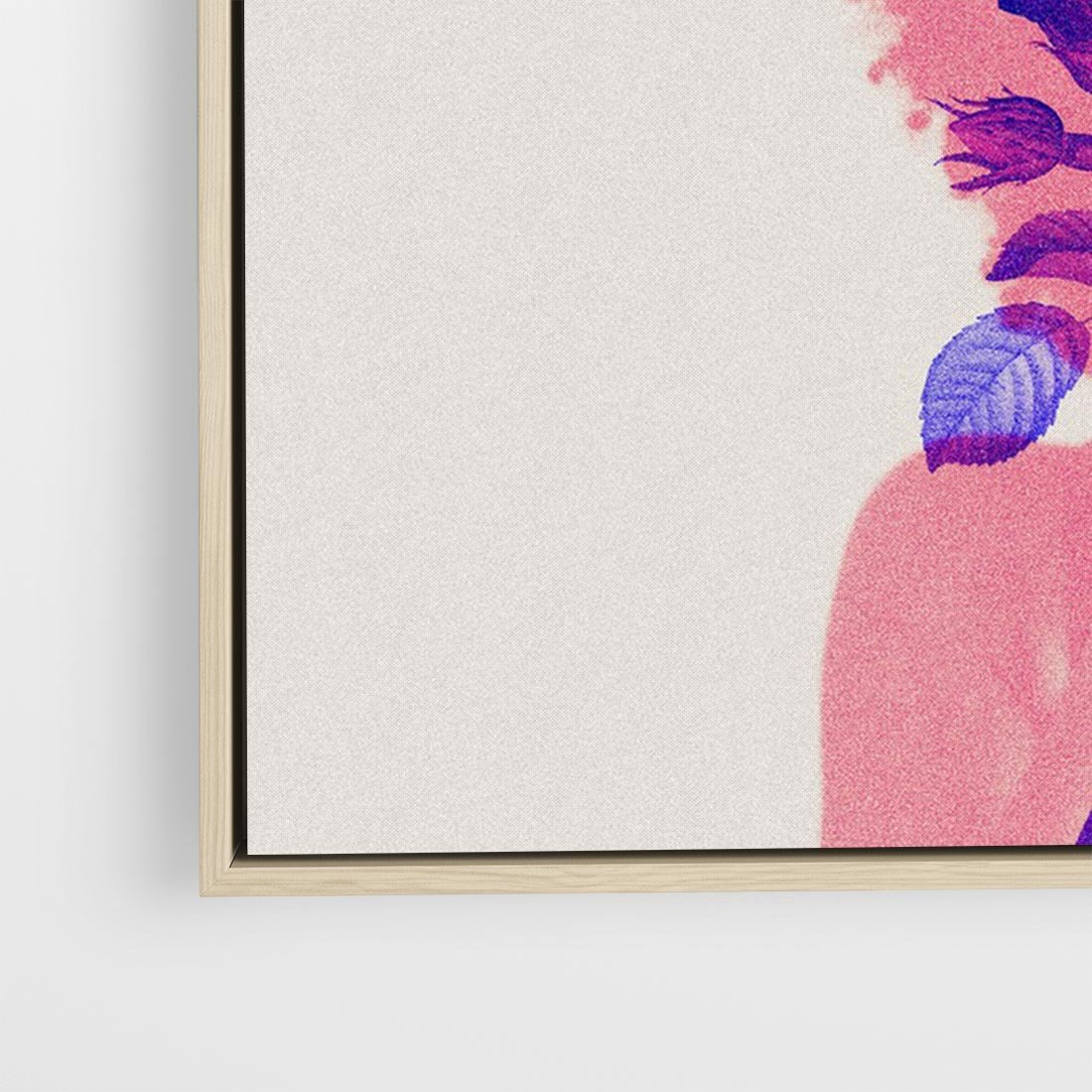 Ta grafika przedstawia abstrakcyjną różową postać kobiety z kwiatami we włosach. Kompozycja tworzy unikalny kolaż, który zachwyca subtelnym pięknem i artystycznym wdziękiem. To wyjątkowe dzieło sztuki nadaje przestrzeni nowoczesności i oryginalności, przyciągając wzrok swoją harmonią kolorów i abstrakcyjnymi formami.