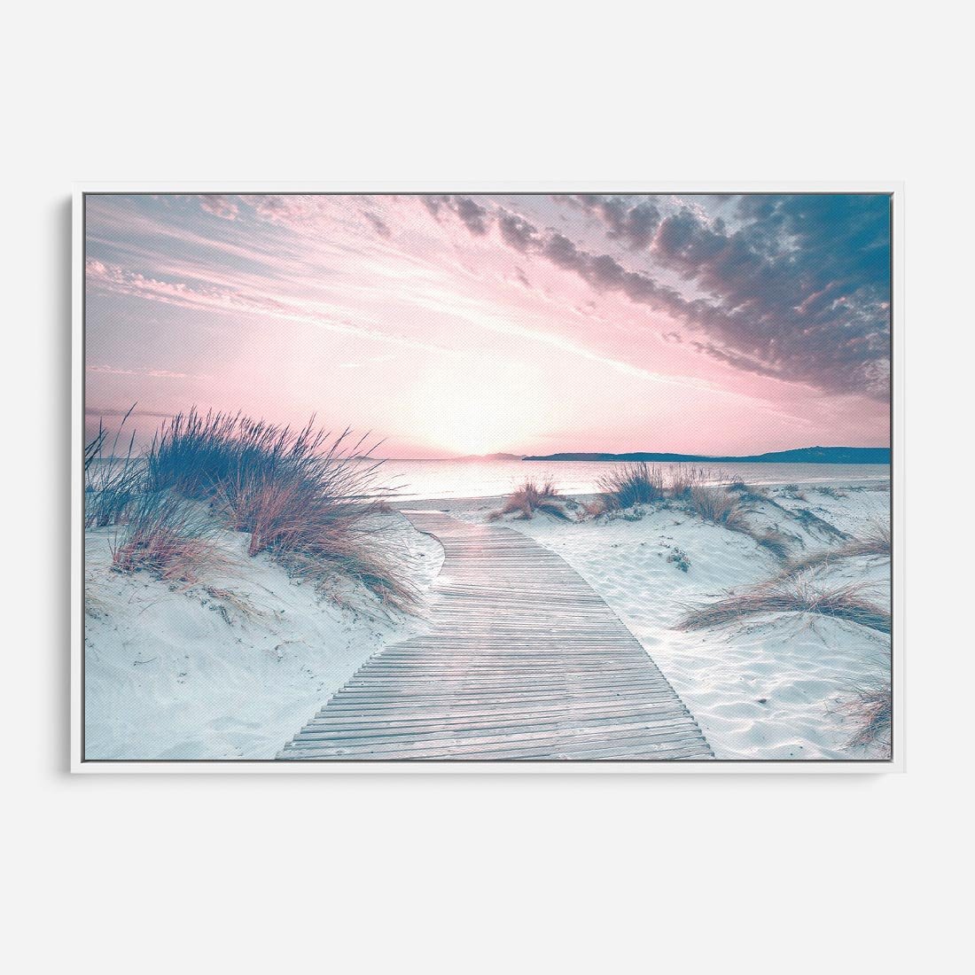 Podziwiaj piękno natury dzięki tej urokliwej fotografii. Na obrazie widzimy zachód słońca nad morzem, a stonowane kolory dodają magii chwili. Ścieżka wśród wydm prowadzi do spokojnego miejsca na plaży. To fotograficzne dzieło sztuki stworzone dla miłośników natury, romantycznych widoków i relaksu. Doskonały akcent dla tych, którzy pragną wprowadzić harmonię i spokój do swoich wnętrz.
