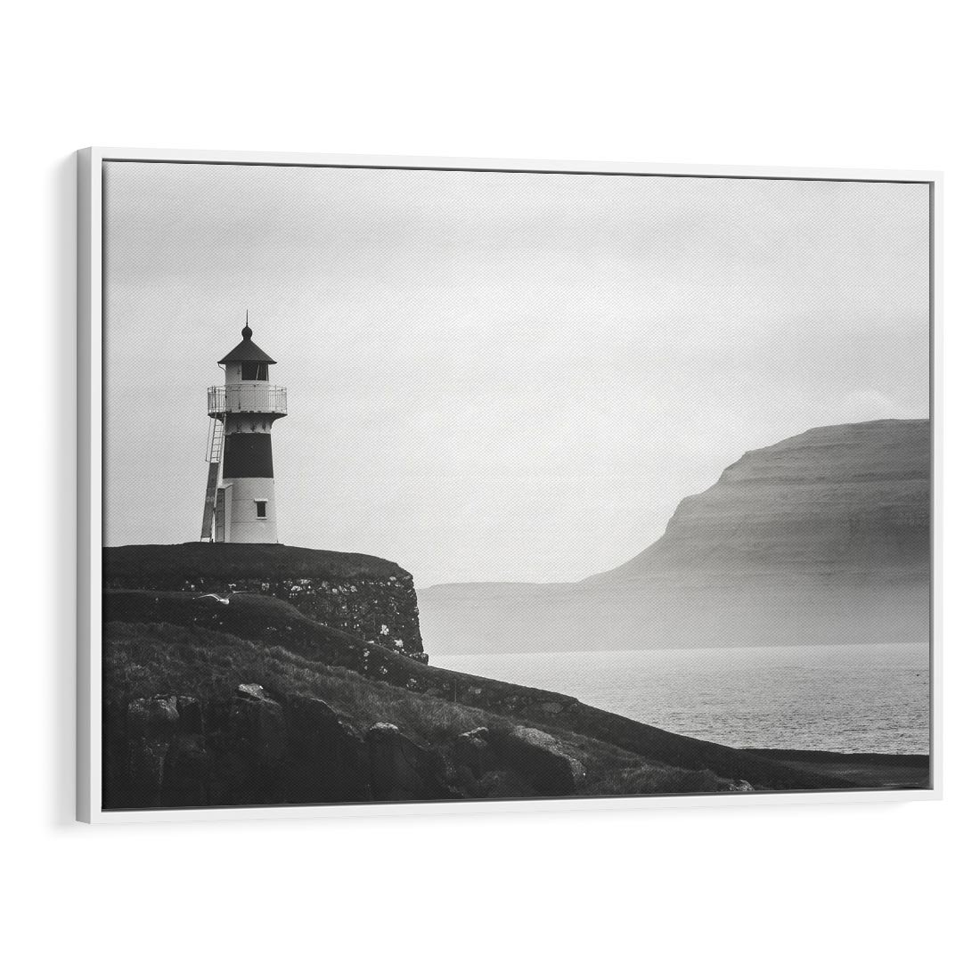 Obraz w ramie 120x80 - Melancholia Północy - czarnobiała fotografia, nadmorska latarnia na klifie - rama biała