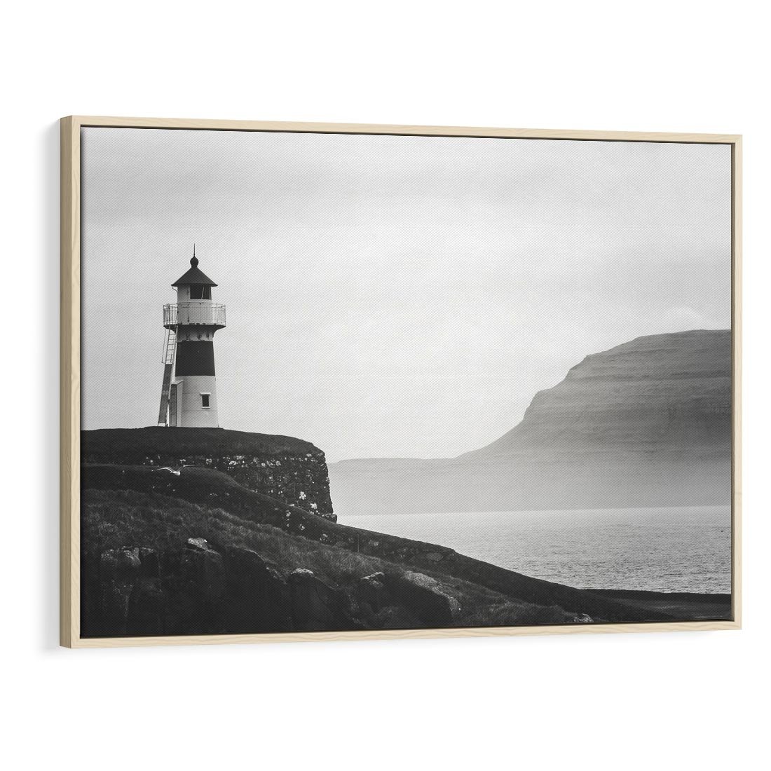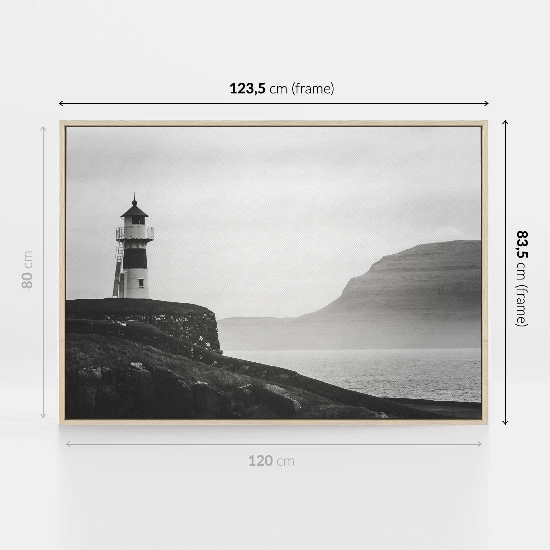 Obraz w ramie 120x80 - Melancholia Północy - czarnobiała fotografia, nadmorska latarnia na klifie - rama drewno