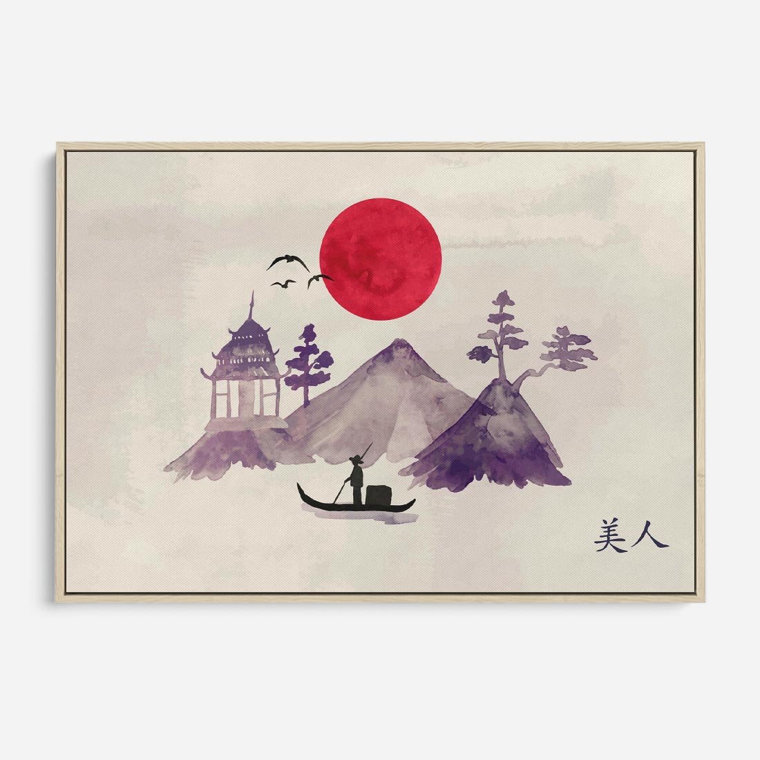 Ta urocza akwarela ukazuje japońską łódź na spokojnym jeziorze, z czerwonym słońcem na horyzoncie. Sztuka emanuje harmonią i spokojem, charakterystycznymi dla japońskiej sztuki. Przenosząc nas w magiczny świat natury, obraz ukazuje urok przyrody i zachodu słońca.
