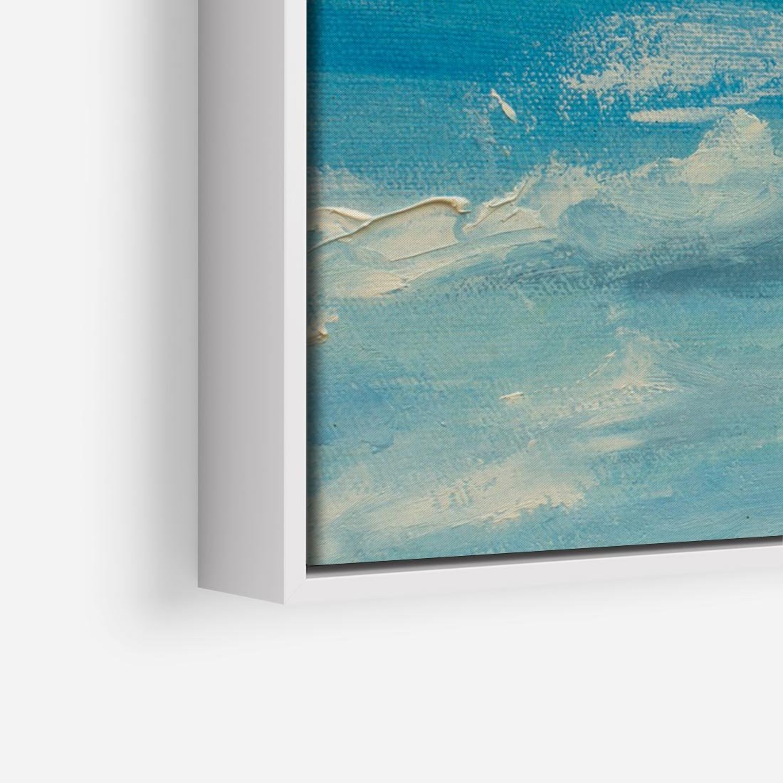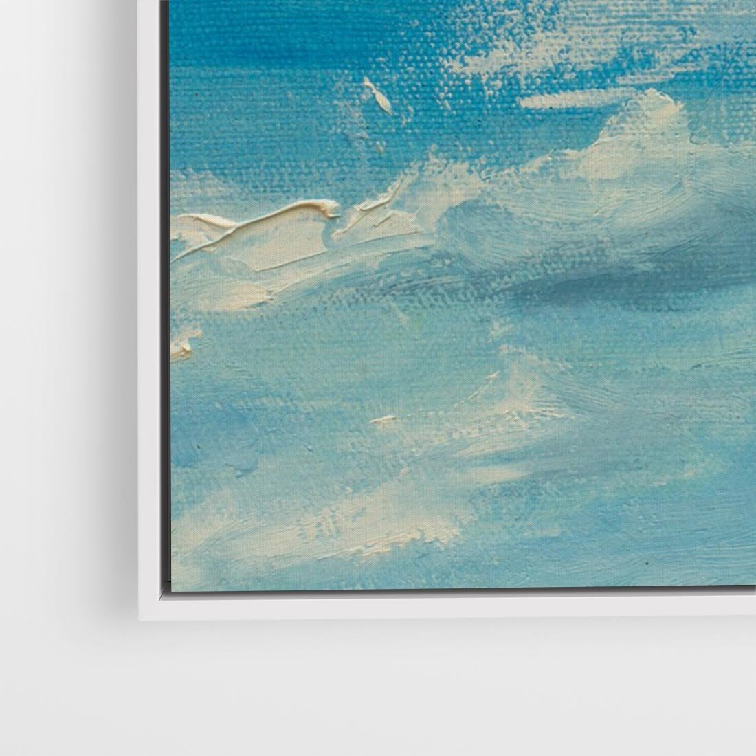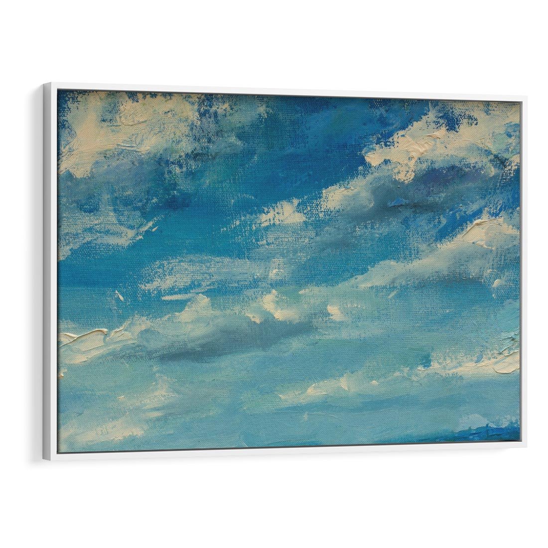 Obraz w ramie 120x80 - Oddechy niebiańskiej materii - olejny obraz, smugi farby przypominają obłoki na błękitnym niebie - rama biała