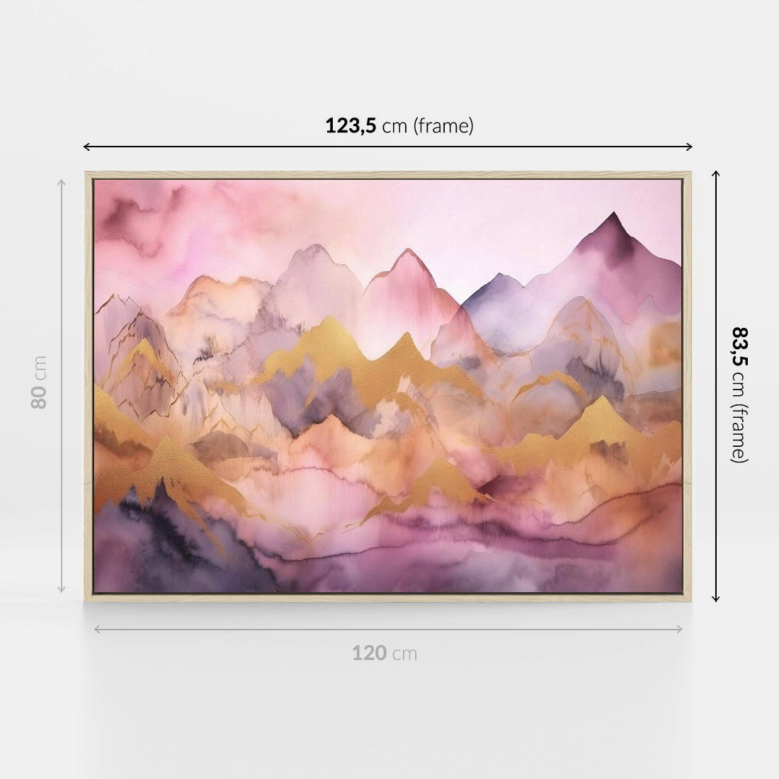 Ten obraz przedstawia pastelowe, różowe góry z akwarelowymi detalami w złotych tonach. Sztuka nowoczesna emanuje spokojem i subtelnością, nadając wnętrzom salonu lub sypialni unikalny urok. Odcienie różu i złota tworzą harmonijną kompozycję, która wzbogaca każdą przestrzeń.