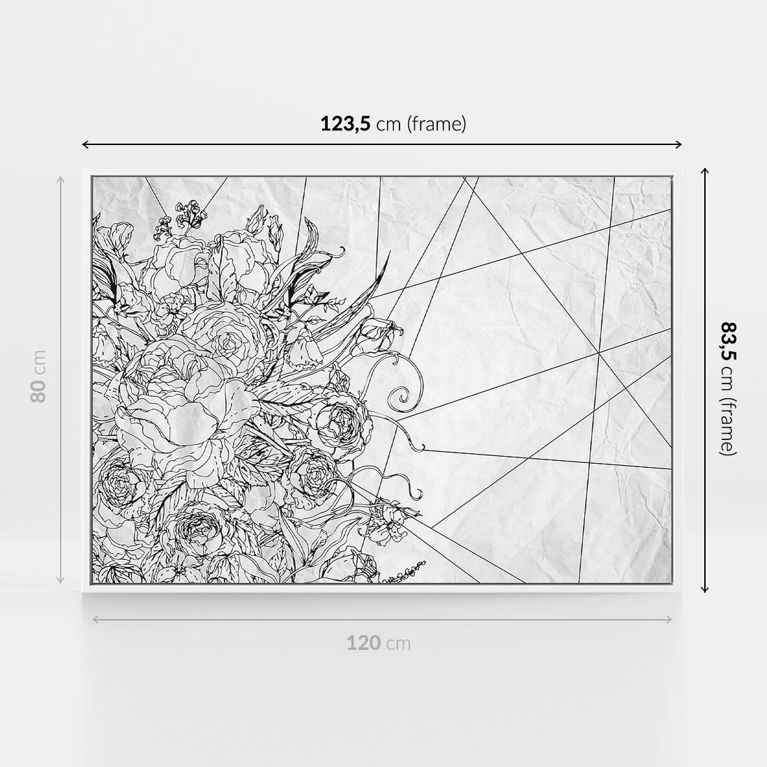 Obraz w ramie 120x80 - Refleksje w martwym punkcie - graficzny szkic, kompozycja kwiatów - rama biała