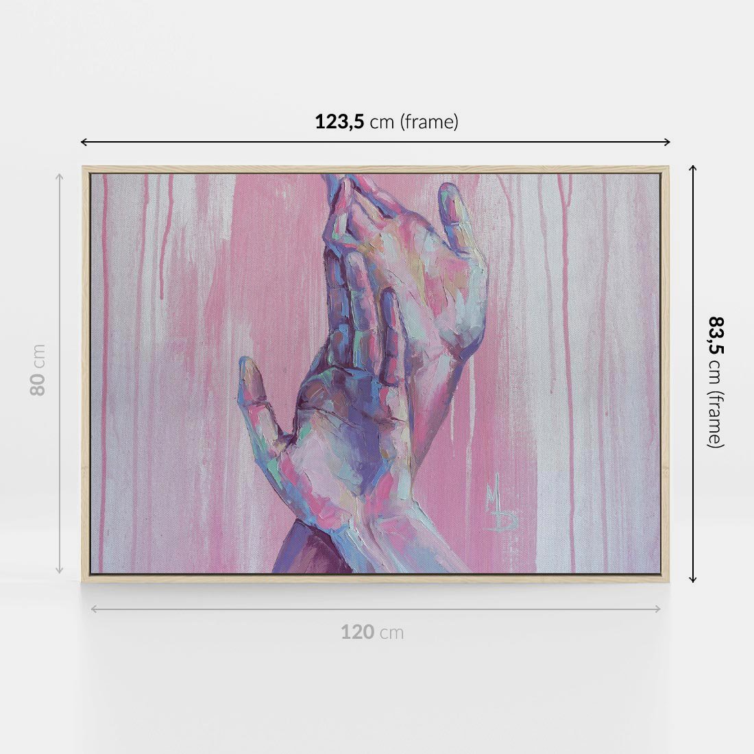 Ten nowoczesny obraz olejny w pastelowych kolorach prezentuje splecione dłonie jako główny motyw. Delikatne odcienie pasteli nadają mu subtelności i spokoju, tworząc jednocześnie abstrakcyjną i znaczącą kompozycję. To dzieło sztuki emanuje harmonią i jednością, symbolizującą współpracę, miłość lub zrozumienie między ludźmi. Idealnie pasuje do wnętrz o nowoczesnym designie, które cenią sobie sztukę jako wyraz emocji i relacji.