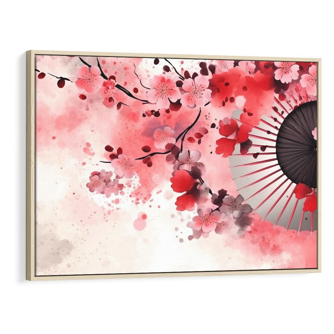 Obraz w ramie 120x80 - Szept Kwitnącej Wiśni - japoński parasol, liście - rama drewno