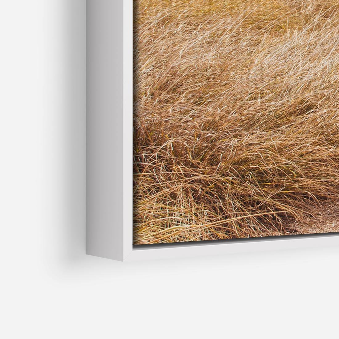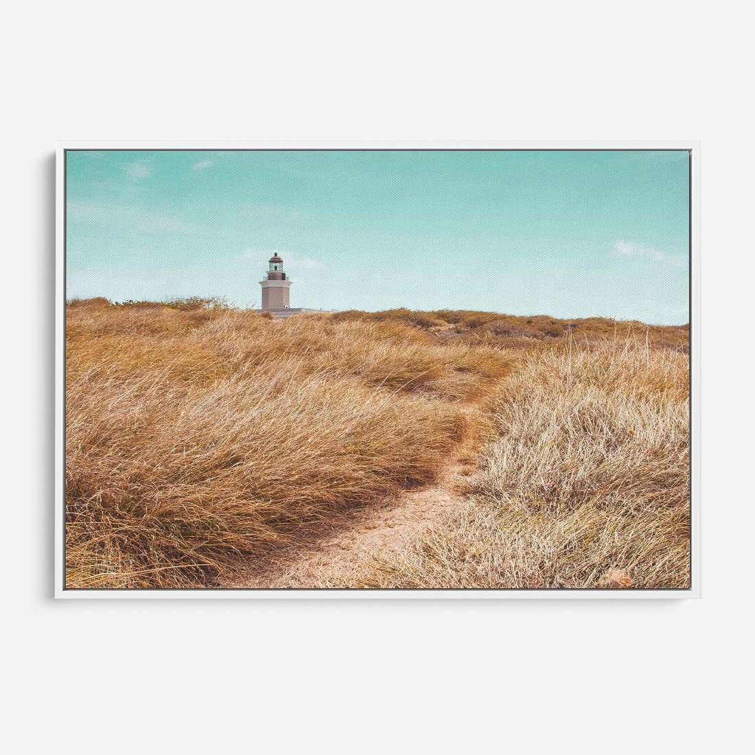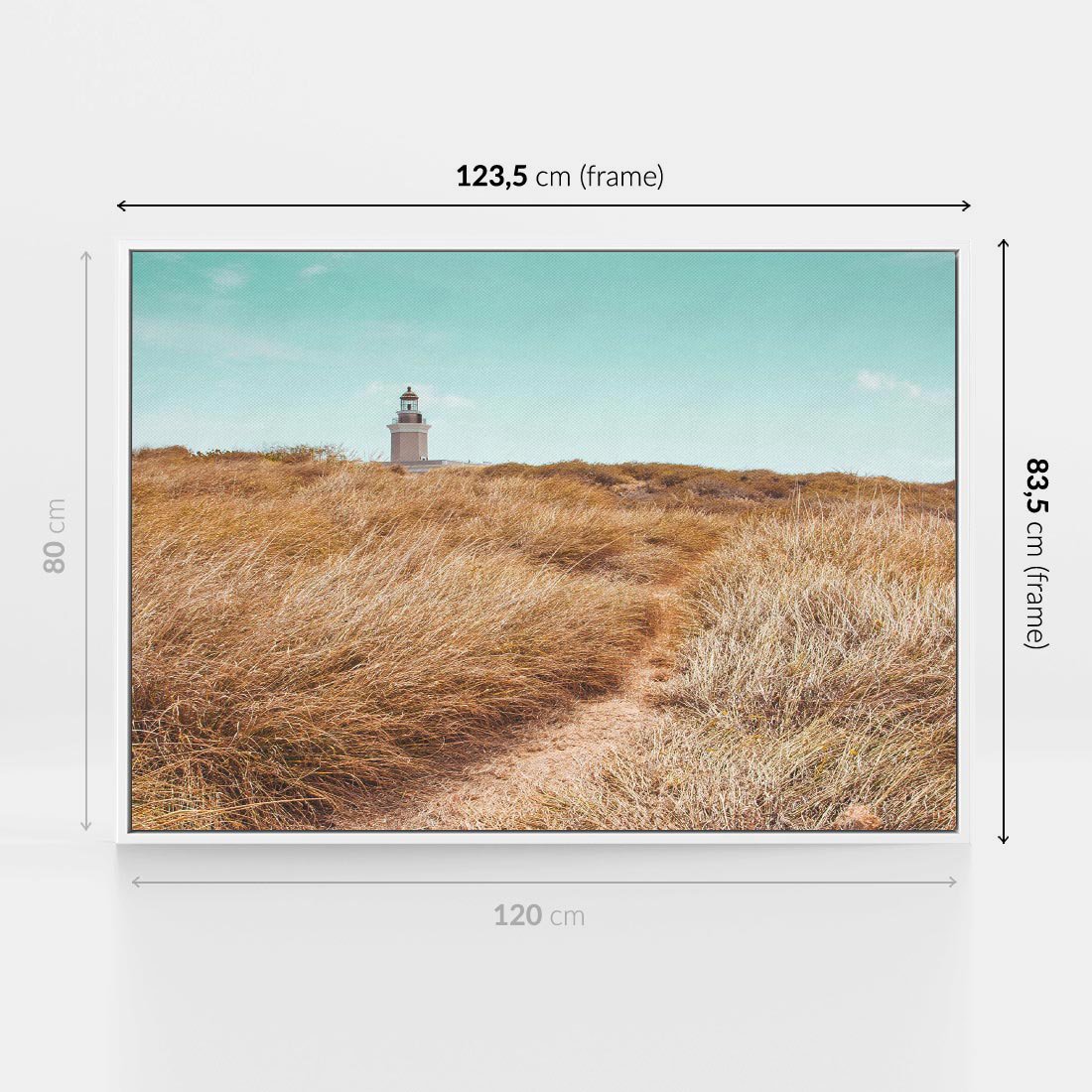 Obraz w ramie 120x80 - Tajemnicza Ścieżka - latarnia morska w oddali, suche trawy - rama biała