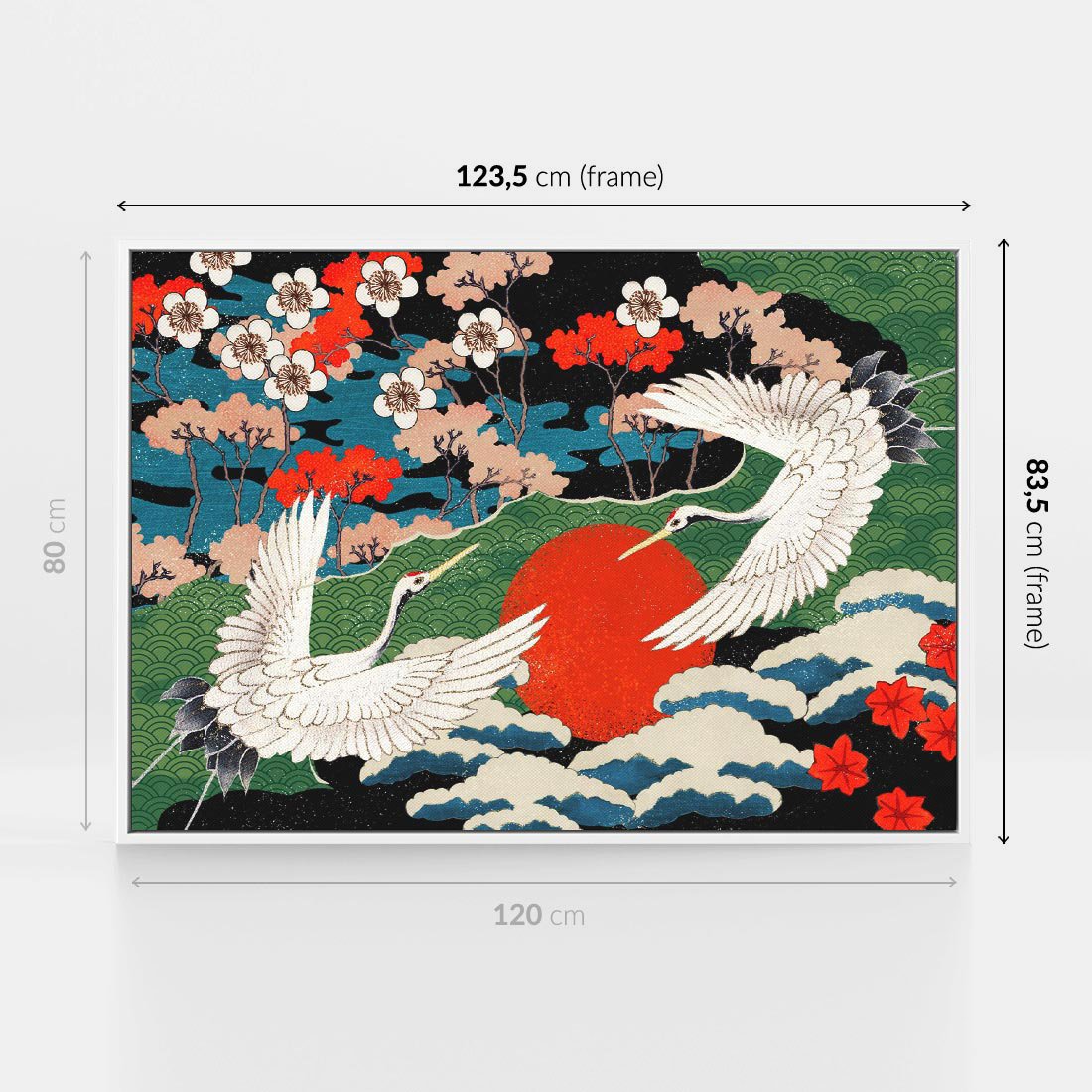 Podziwiaj wyjątkowy obraz inspirowany sztuką japońską, gdzie wyraziste kolory ożywiają motywy żurawi i kwitnącej wiśni. To dzieło sztuki stworzone dla miłośników delikatnej estetyki i symboli natury. Doskonały akcent dla tych, którzy pragną wprowadzić harmonię, piękno przyrody oraz ducha Japonii do swoich wnętrz.