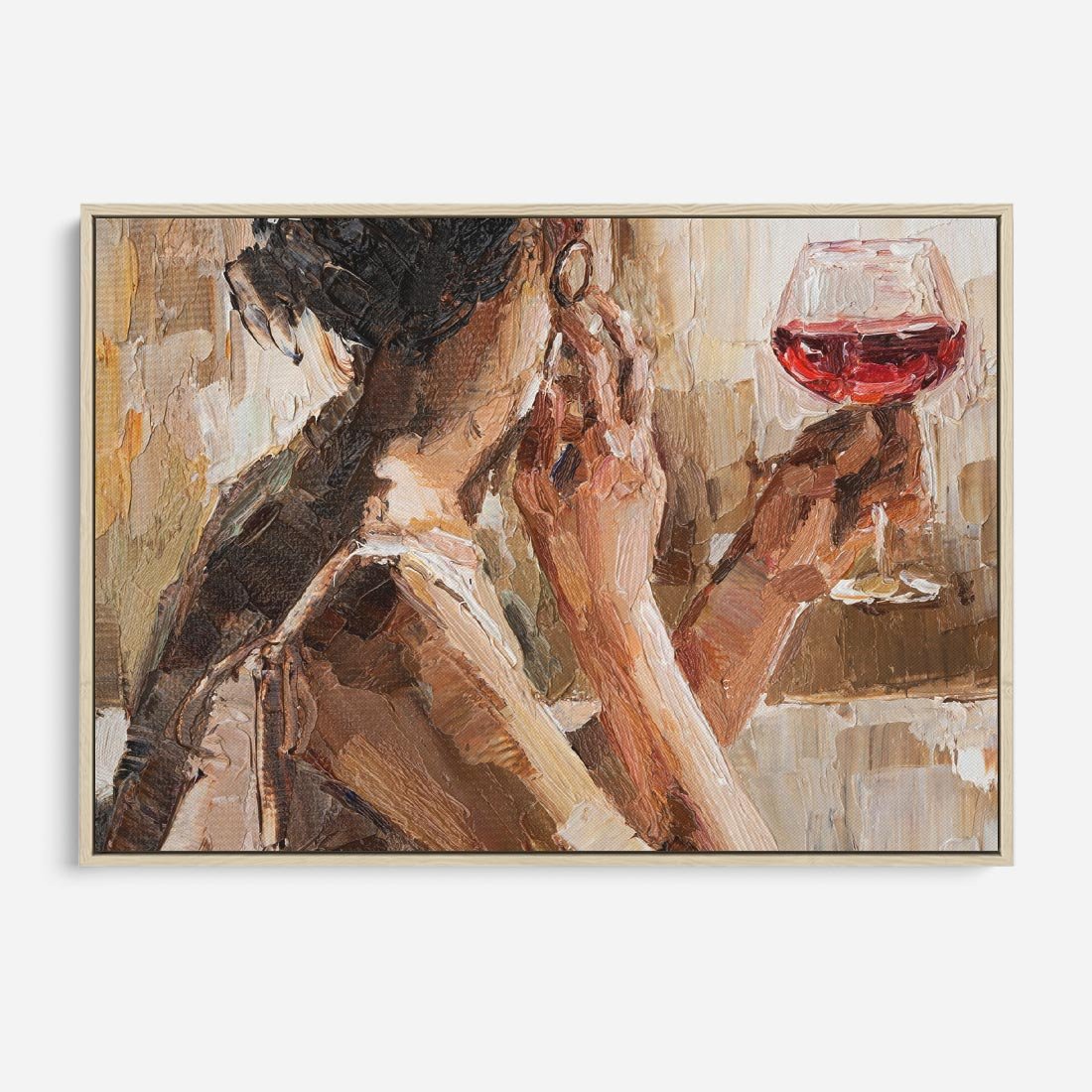 Abstrakcyjny portret tej tajemniczej kobiety ukazuje jej zmysłowy urok i elegancję. W tle widzimy kieliszek wina, który symbolizuje jej pasję do życia i radość bycia sobą. Obraz olejny w stylu impresjonizmu zdobi przestrzeń mocnymi pociągnięciami pędzla, które nadają mu unikalny, emocjonalny charakter.
