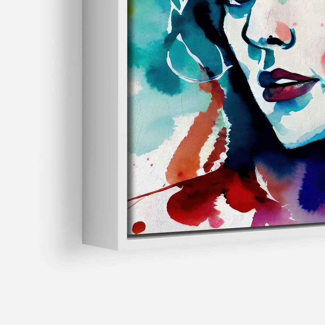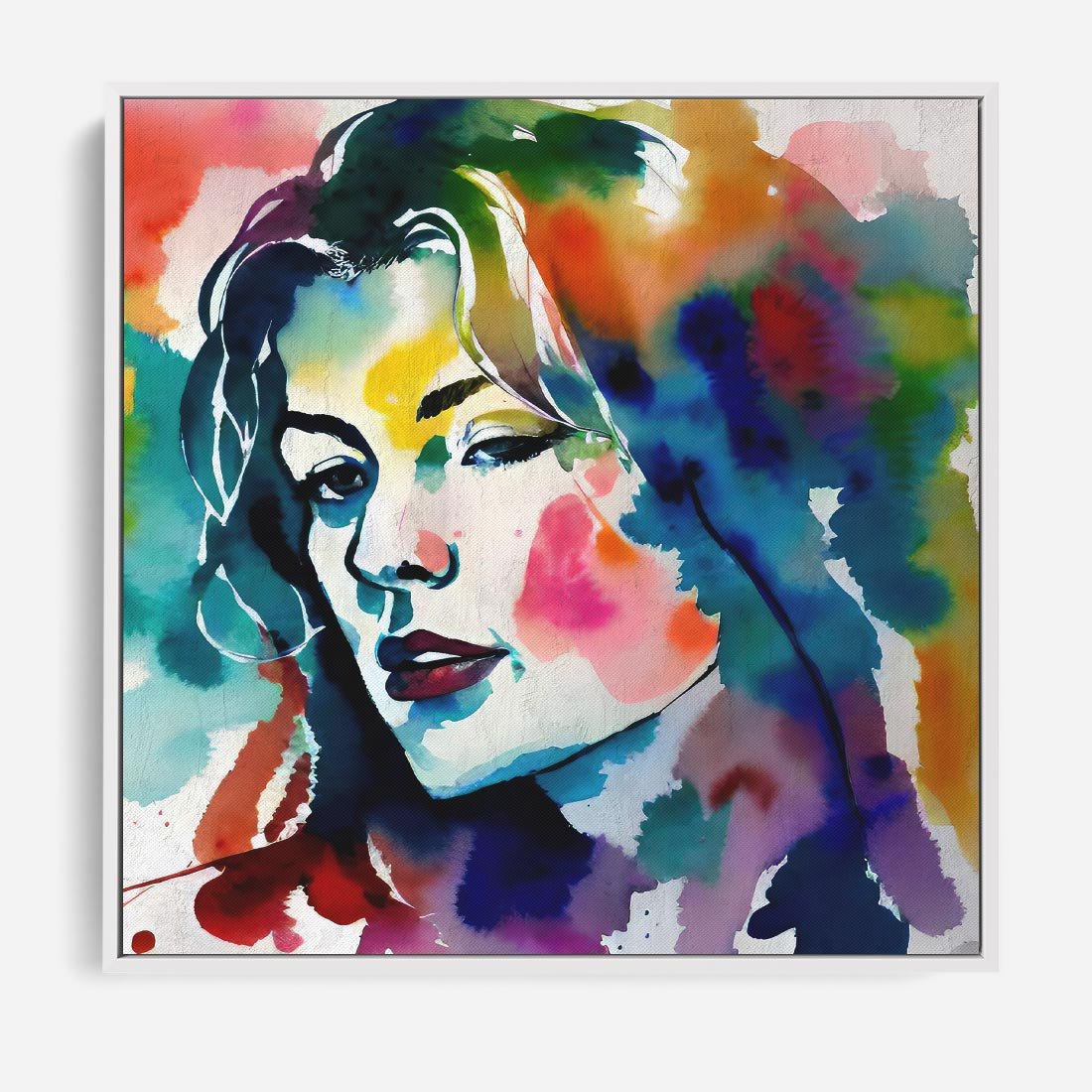 Czarna kreska w abstrakcyjnym portrecie kobiety jest delikatną osią, która kontrastuje z ekspresyjnymi akwarelowymi plamami rozpryśniętymi na płótnie. To zmysłowe połączenie wydobywa osobowość i emocje postaci , tworząc fascynujący taniec formy i koloru.