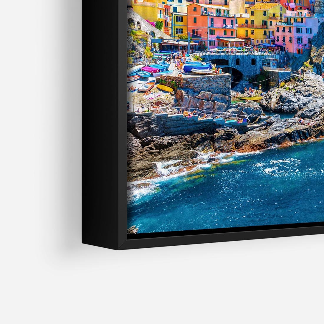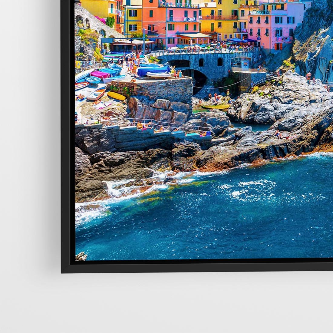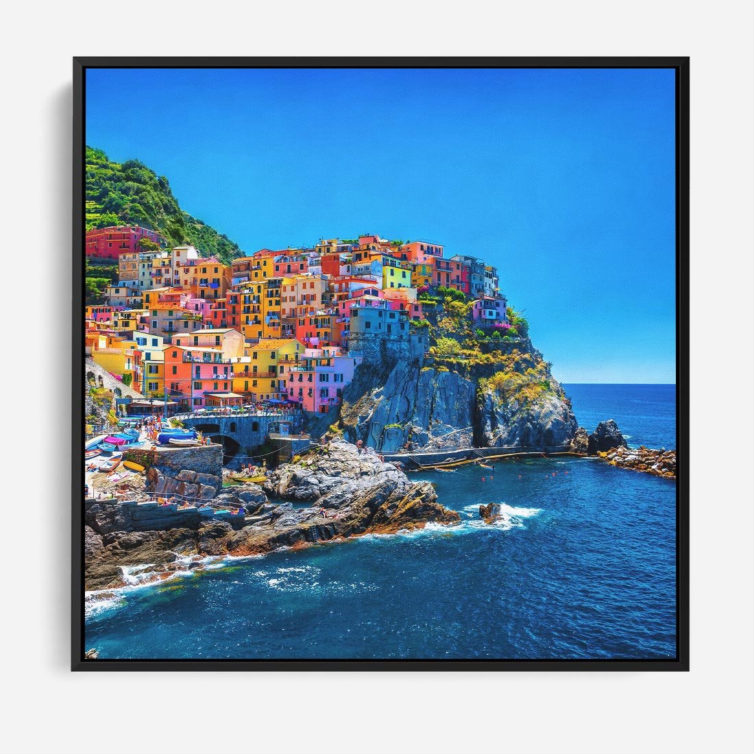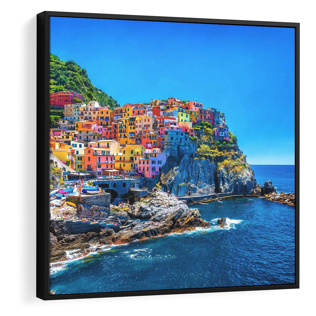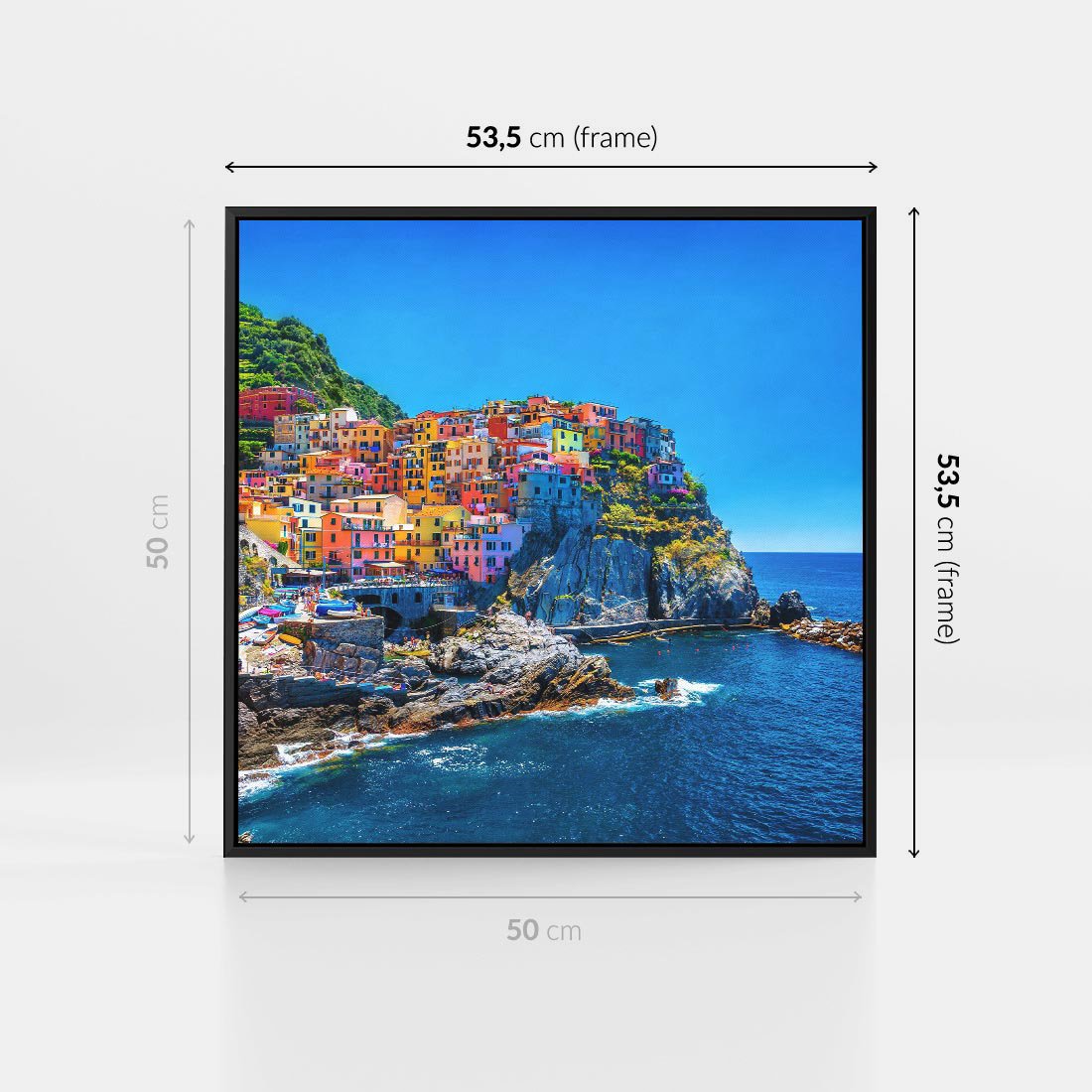 Obraz w ramie 50x50 - Barwne Wybrzeże - nadmorskie miasto na klifie, kolorowe tęczowe budynki - rama czarna