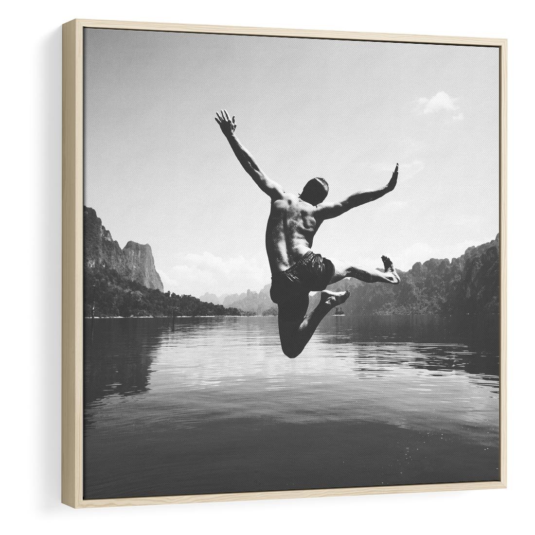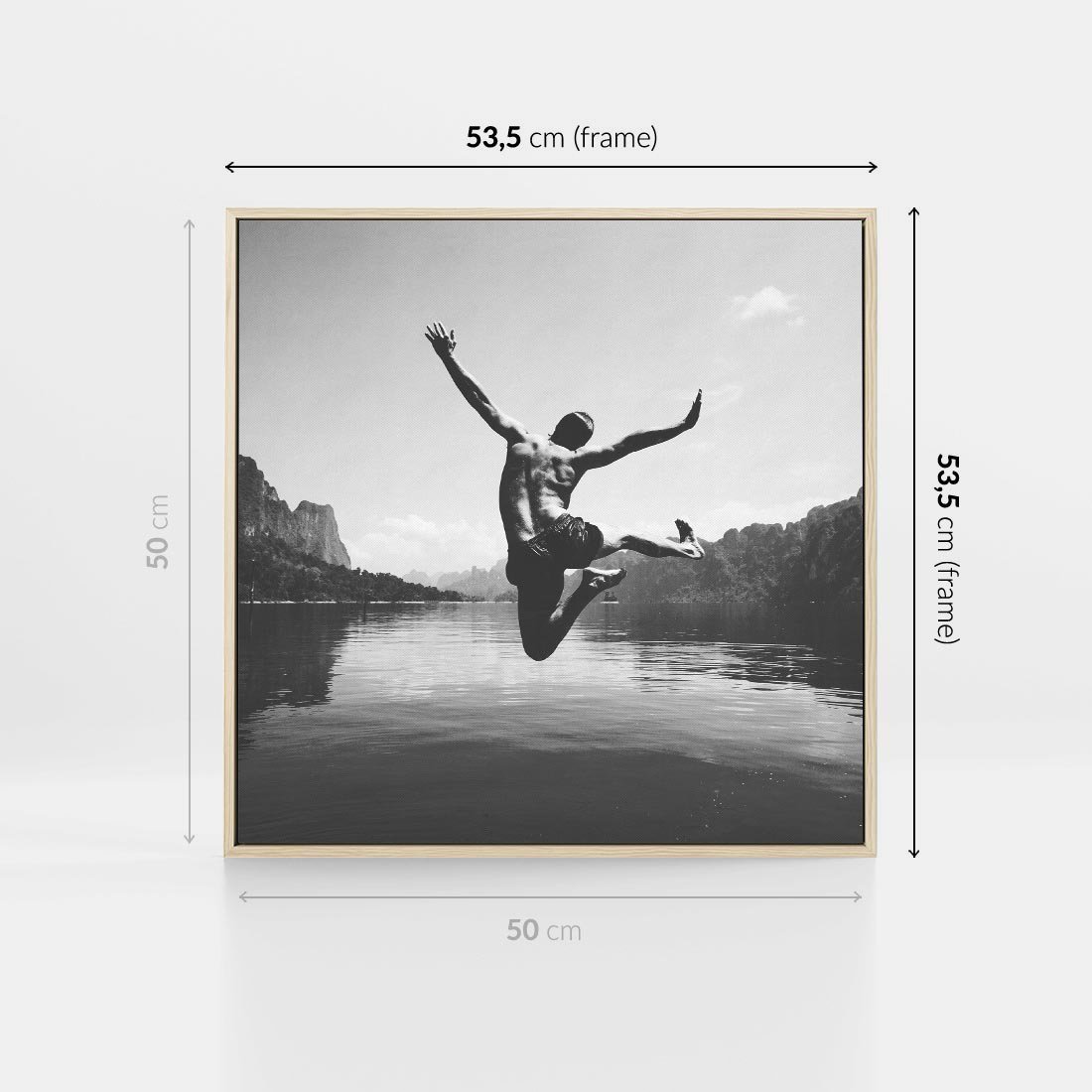 Obraz w ramie 50x50 - Beztroska Chwila - czarno biała fotografia, mężczyzna wesoło wskakuje do keziora w górach - rama drewno